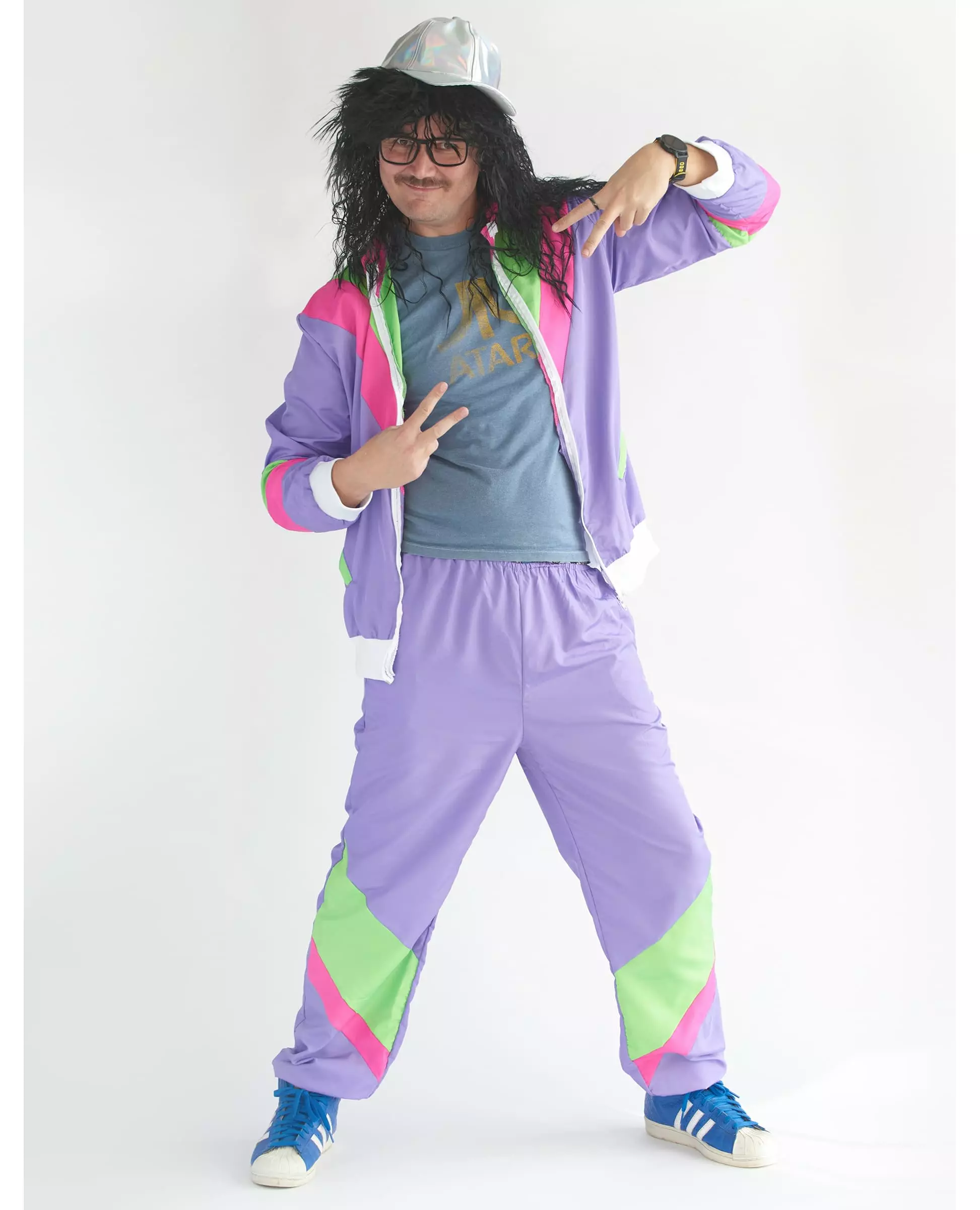 Adopt a retro look for your 80s party This retro costume for men consists of a jacket and pants. The jogging jacket is light purple, with wide green and pink stripes. It has fake pockets on the sides, and closes with a zip on the front. The pants match the jacket. They are also purple, with green and pink diagonal stripes on the bottom. This 80s outfit will be perfect for participating in Carnival or a kitsch themed party. Accessories included: Jacket Pants Material: 100% Polyester Care: Hand wash