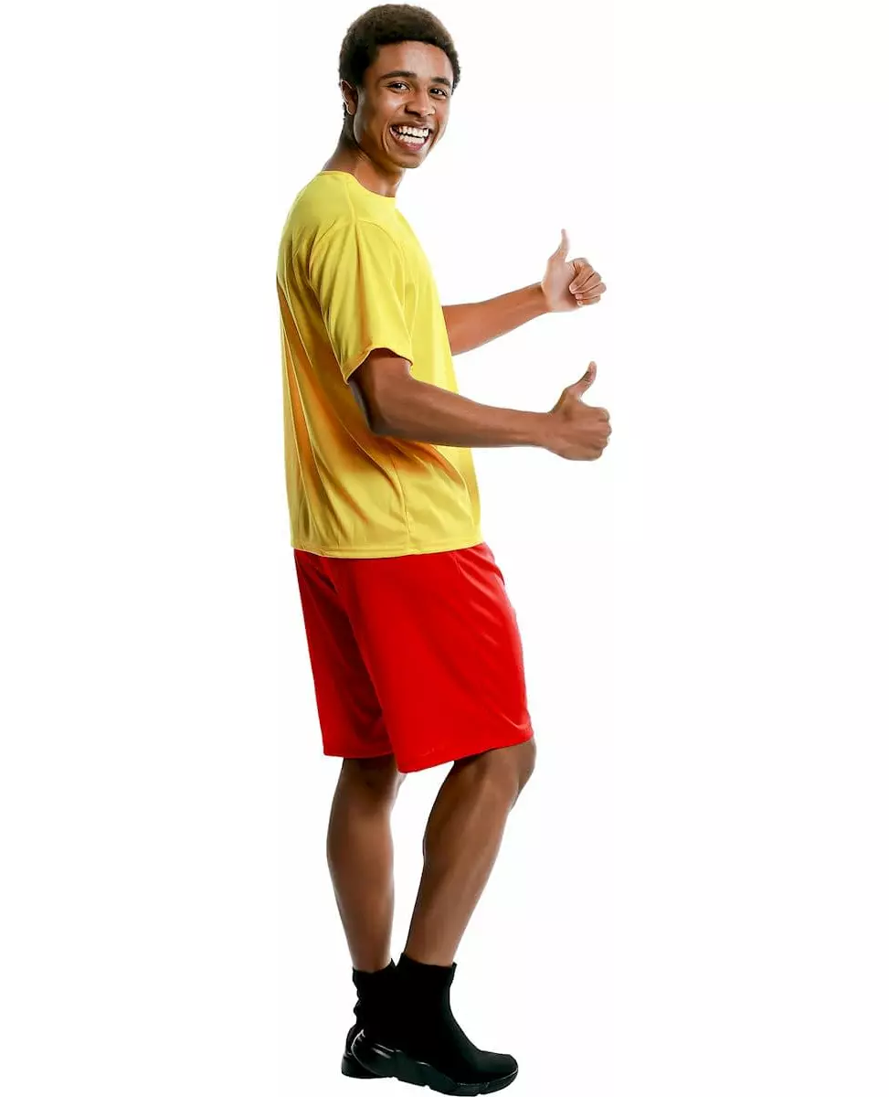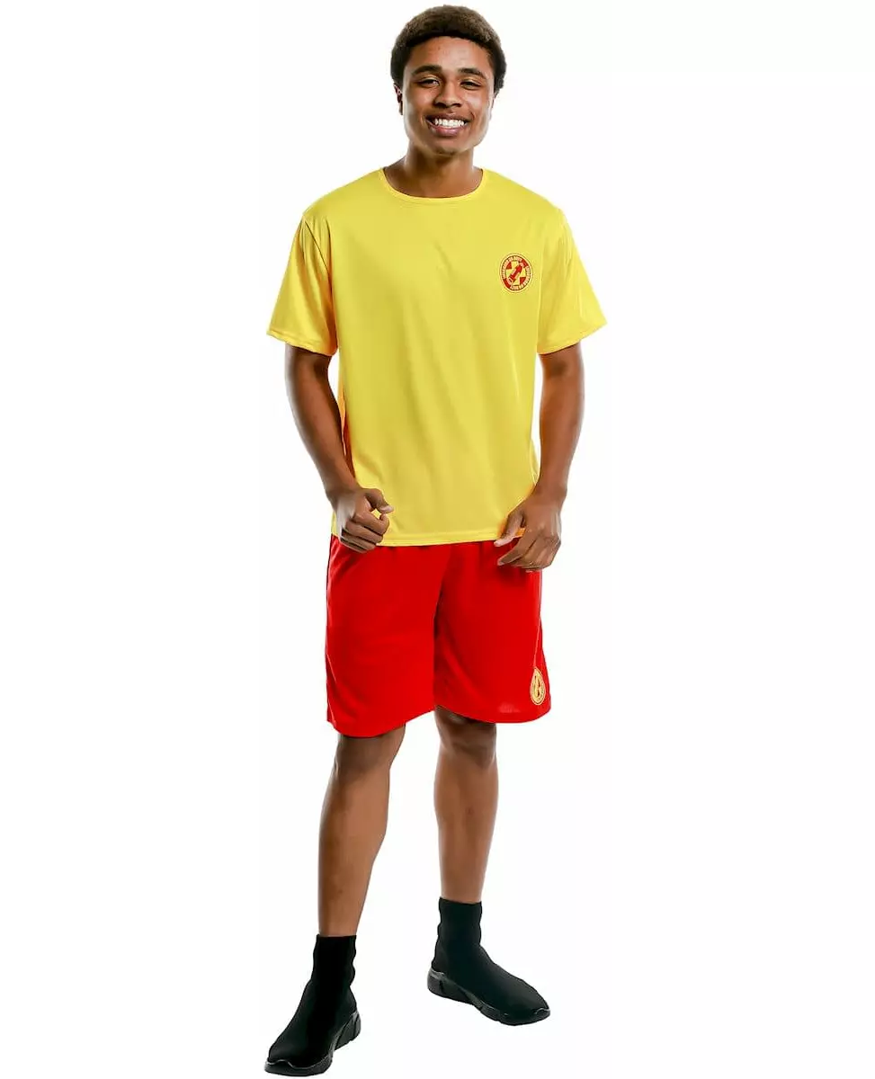 It will save your life! This lifeguard costume is for men. It consists of a t-shirt and shorts. The t-shirt is yellow and decorated with a "Lifeguard on duty" crest. The shorts are red and have the same crest. This costume is a perfect idea for a summer party or a humor-themed costume party with friends! Accessories included: Top Shorts Material: 100% Polyester Care: Hand wash