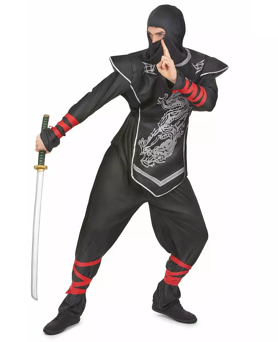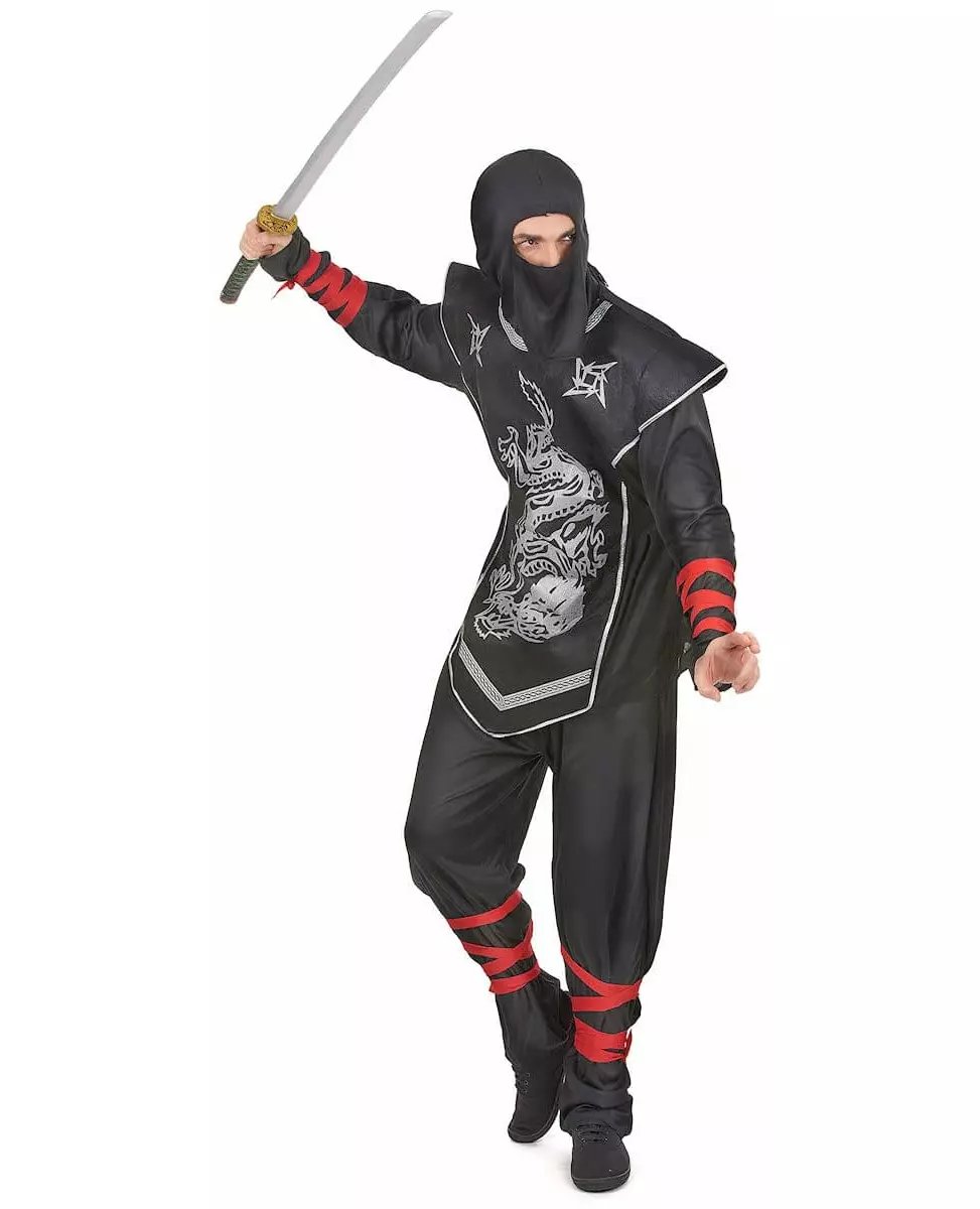Thick foam chest protector! This ninja costume for men consists of a top, a chest protector, pants, and a hood (saber not included). The top is black and has long sleeves. You can wrap your forearms with intertwined matte red ribbons. The chest protector is sewn onto the top. It is made of thick felt, and with its epaulettes, it will definitely give you a great look. You only have to tie two ties in the back to adjust it to your body shape. A dragon and gray shuriken are flocked on the front. The pants are wide and have an elastic waistband to ensure your comfort. At the calves, you can intertwine red ribbons to cinch the bottom of the pants. Finally, the hood will velcro at the nape of your neck and leave your eyes uncovered. Here is a very complete disguise to go incognito with your friends at the Carnival or for any other fancy dress event!. Accessories included: Pants Top Hood Breastplate Material: 100% Polyester Care: Hand wash