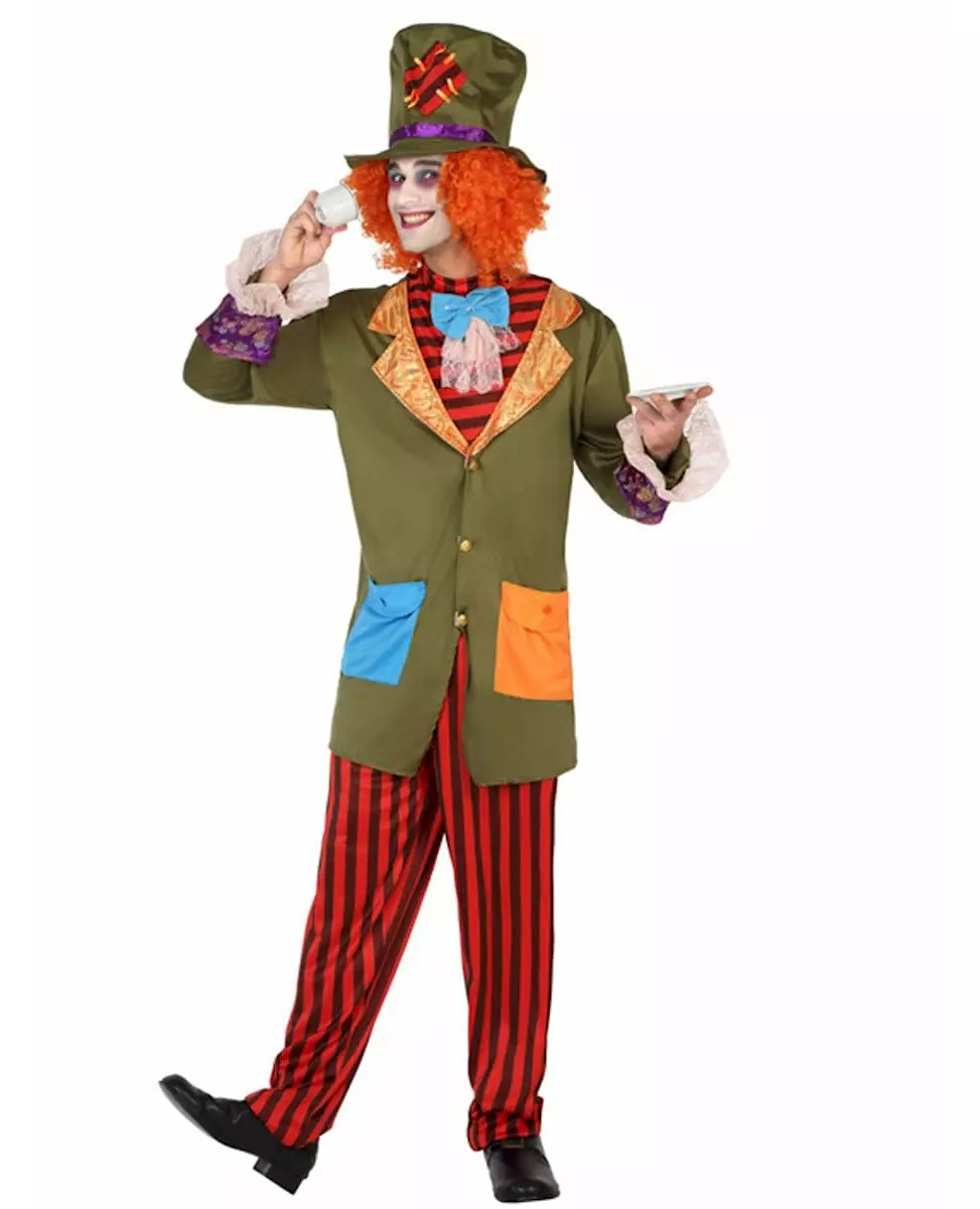 The Hatter is now striped! This men's hatter costume includes a jacket, pants, a hat, and a choker (wig and shoes not included). The green jacket fastens with three Velcro fasteners covered by buttons. Two real colored pockets are present at the front. The collar and sleeve ends have flower patterns. The sleeve ends are lace. The pants have an elasticated waistband and vertical red stripes. The choker, also striped, fastens with Velcro at the back of the neck. A blue rhinestone bow is present at the front and has lace hanging from it. The top hat is decorated with a purple ribbon and a striped red fabric insert. This very colorful hatter costume will make you an original man for carnival this year!. Accessories included: Jacket Hat Pants Neck warmer Material: 100% Polyester Care: Hand wash