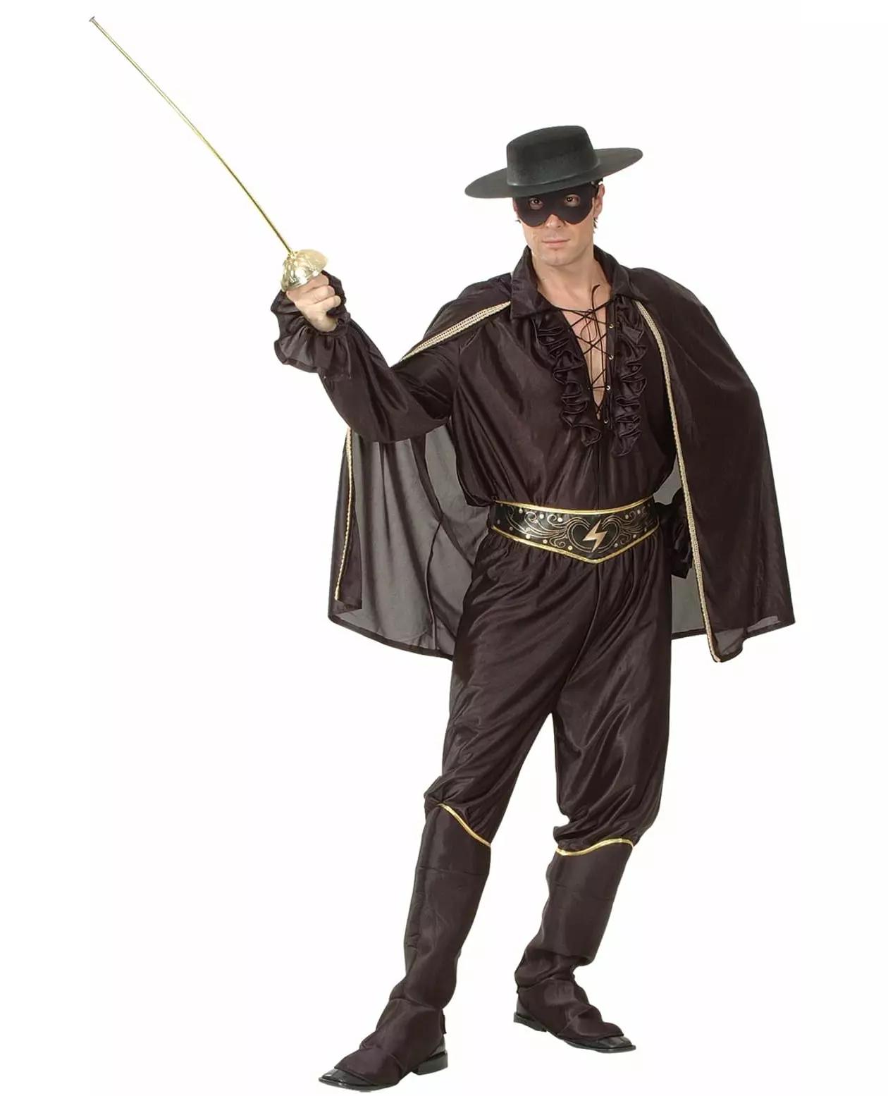 Complete costume! This masked vigilante costume includes a top, a cape, pants, a soft hat, a mask, a belt, and boot covers (sword not included). This costume is made from a thick black fabric with satin highlights. The top has long sleeves and a V-neck where you can lace the collar as you wish. On your shoulders, trimmed in gold, a wide cape will give you the most heroic look of your costume. The pants have an elastic waistband and will be covered at the calf by felt boot covers trimmed in gold on top. You can mark your waist with the belt to tie in the back. A wide-brimmed felt hat will adorn your head. It will fit head sizes around 57 cm. And finally, to complete your outfit, a mask to tie at the back of the head is provided. Go and defend law and order at Carnival or any other costume event!. Accessories included: Pants Overboots Hat Mask Cape Belt Top Material: 100% Polyester Care: Hand wash