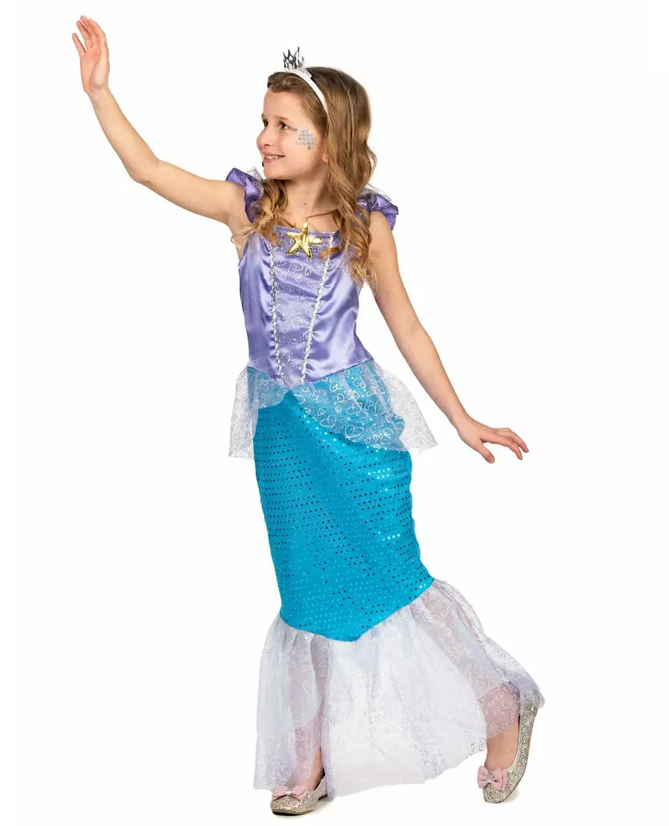 Become a real mermaid! This mermaid costume for girls consists of a dress and a headband. The dress is long and represents the body of a mermaid with legs forming a fish tail. The top is satin purple, the bottom is shiny turquoise blue to imitate fish scales and the bottom of the dress has tulle veils to imitate a fish fin. The headband is a silver crown that will perfectly complete this costume. This mermaid costume will be perfect for a fancy dress party or Carnival! Accessories included: Dress Headband Material: Polyester Care: Hand wash