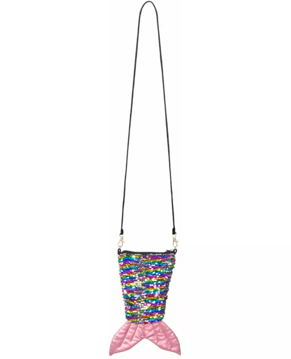 Complete your mermaid costume with this sequin bag. This adult bag is shaped like a mermaid tail. The fins are made of light pink fabric. The mermaid tail is covered in sequins. These are reversible! When you run your hand over it, you will see that on one side they are silver, and on the other they are multicolored. This bag closes with a zip, and is carried with a long handle. This accessory will perfectly complete your mermaid costume for Carnival. Accessories included: Bag, Material: 93% polyester, 7% iron,