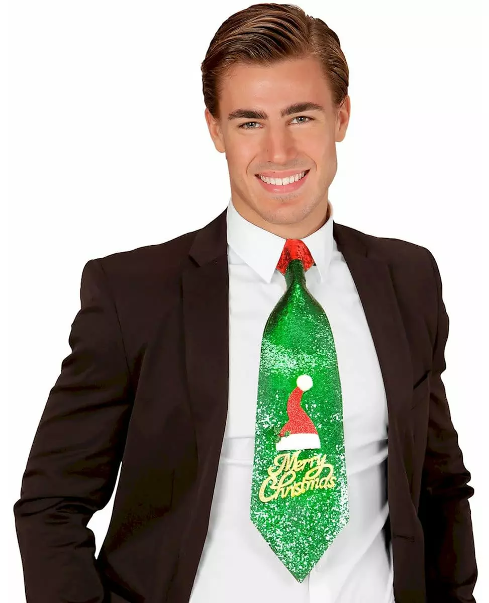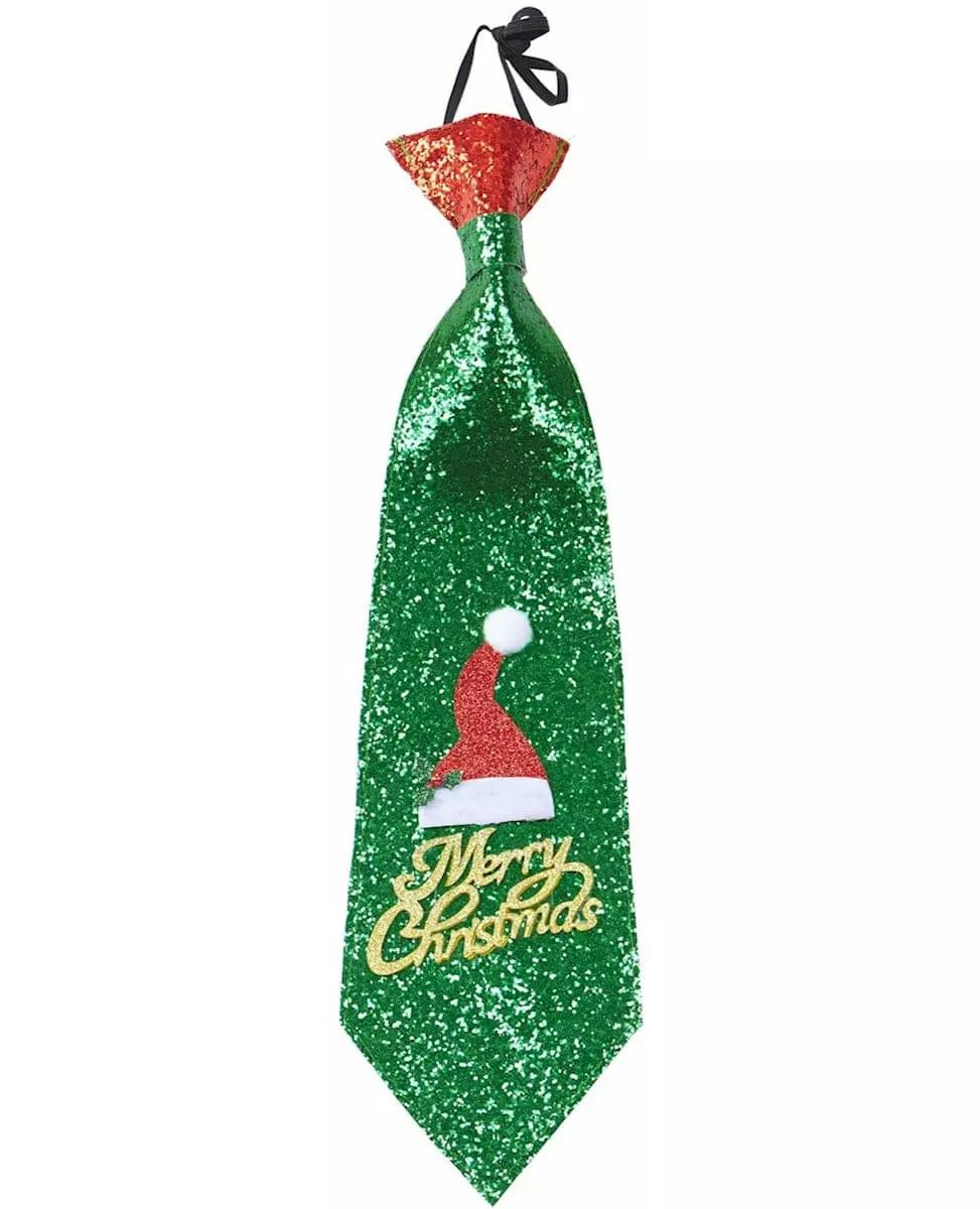 Merry Christmas! This Merry Christmas tie is green and red. It is decorated with sequins and a Santa hat. It has the words "Merry Christmas" in beautiful gold letters. This sequin tie will add sparkle to your Christmas dinner!. Accessories included: Tie