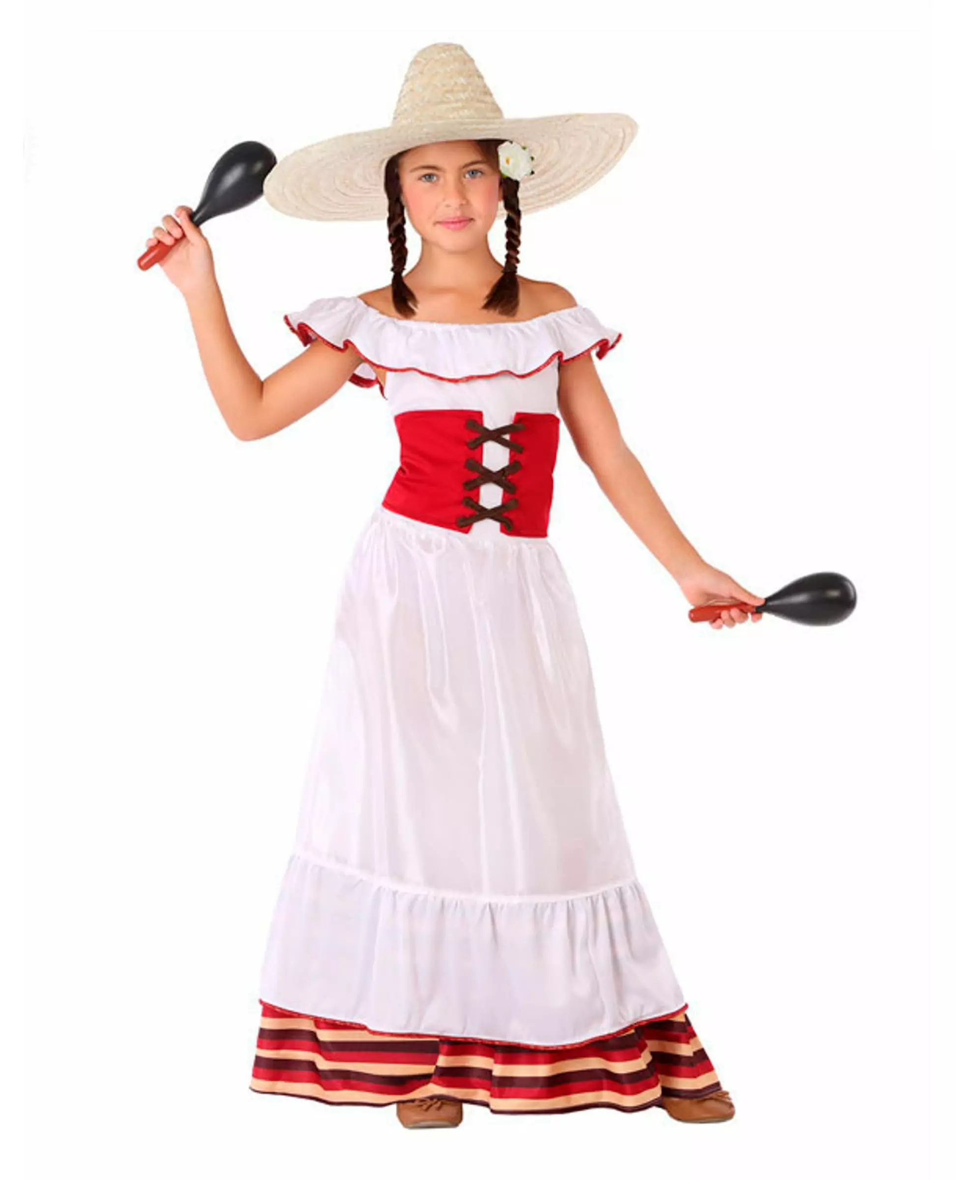 Mexico! This Mexican costume for girls consists of a dress sold separately. The dress has boat-sleeved sleeves and is white with red stitching on the collar. The dress features a fake red and brown bodice. The bottom of this long, flared dress is also striped in shades of red, beige, and brown. This Mexican costume will be ideal for a world party or a Carnival. Accessories included: Dress Material: Polyester Care: Hand wash