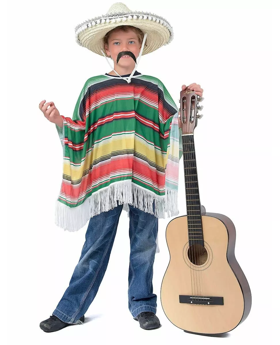 For a Mexican touch! This poncho is for children, the product is sold individually. This brightly colored Mexican poncho is striped in green, black, red, yellow and white with lines of various sizes for a very colorful look with small white fringes on the lower end. This Mexican sweater will be perfect for a party with a theme of different countries or during Carnival!. Accessories included: Poncho Material: Polyester Care: Hand wash Measurements: 53 cm long and 103 cm wide