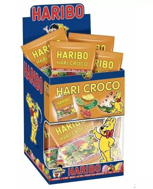Haribo crocodile sweets for a birthday! This mini bag of Haribo crocodile sweets contains 40g. It will be perfect to enjoy at a birthday party. Ingredients: glucose syrup; sugar; dextrose; gelatin; acidifier: citric acid; fruit and plant concentrates: safflower, spirulina, apple; invert sugar syrup; flavoring; colors: carmines, lutein; coating agents: white and yellow beeswax, carnauba wax. Keep away from heat and humidity. Accessories included: 1 mini bag
