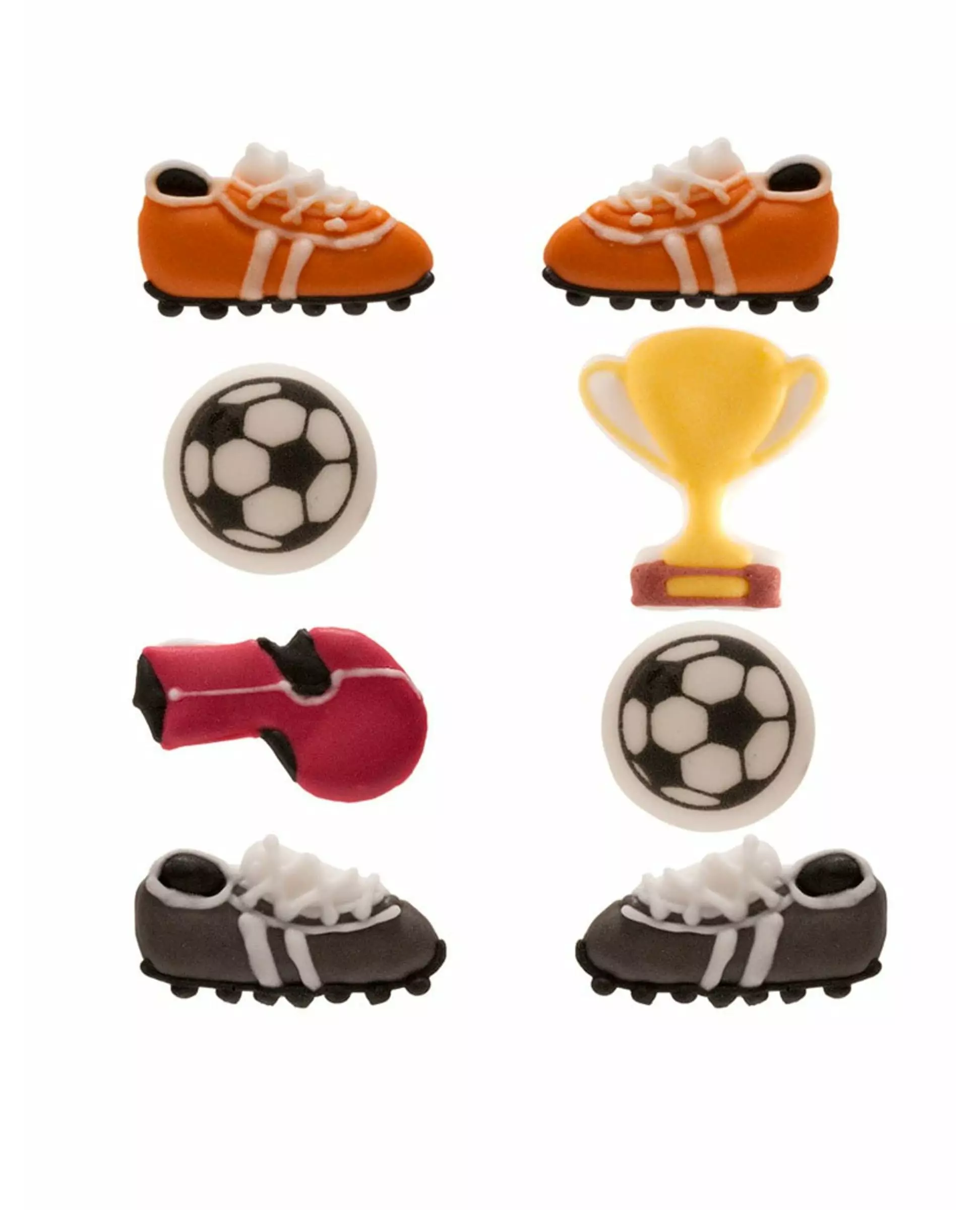 For football fans! This set consists of 8 sugar decorations. They measure approximately 1 x 1.7 x 2 cm. They represent football boots, footballs, a trophy and a whistle. These mini edible decorations will be perfect for decorating your football-themed birthday cake. Ingredients: Sugar, Milk protein Thickening agent: E414 Acidifiers: E330 Vegetable concentrate: Safflower Humectant: E422 Emulsifier: E322 Colourings: E100 500, E150d, E160a, E171, E172. Accessories included: 8 cake decorations Material: Sugar