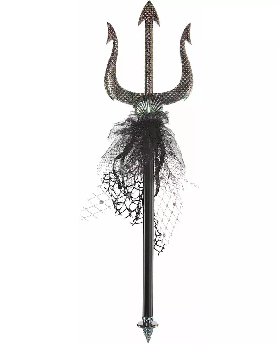A mermaid doesn't go anywhere without her trident! This accessory is a mini mermaid trident for adults, approximately 50 cm long. This trident has a black handle decorated with a silver shell and black tulle. The silver trident with pearly reflections and a scale pattern is very elegant. Choose this quality trident to accessorize your mermaid costume for Carnival or a sea-themed costume party! Accessories included: Trident Material: Plastic, polyester Care: Hand wash