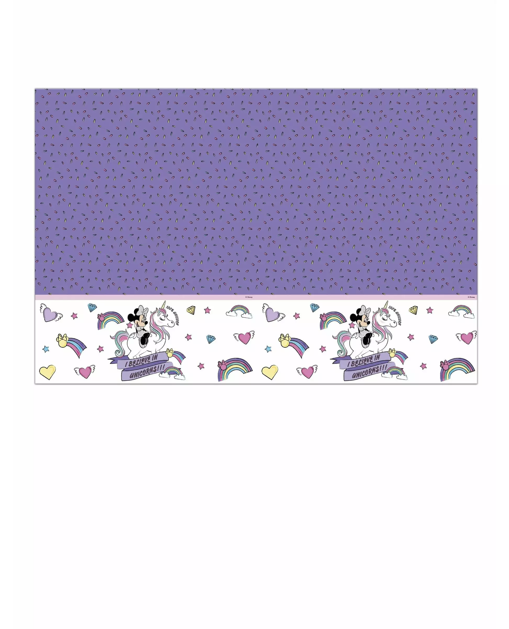 A cute Minnie tablecloth! This tablecloth is officially licensed by Minnie and the Unicorn™. It is made of plastic and measures approximately 120 x 180 cm. The middle is purple and the edge is decorated with Minnie on a unicorn with hearts, diamonds and colorful rainbows. This tablecloth will be perfect to complete your Minnie birthday decoration!. Accessories included: 1 Tablecloth Material: Plastic