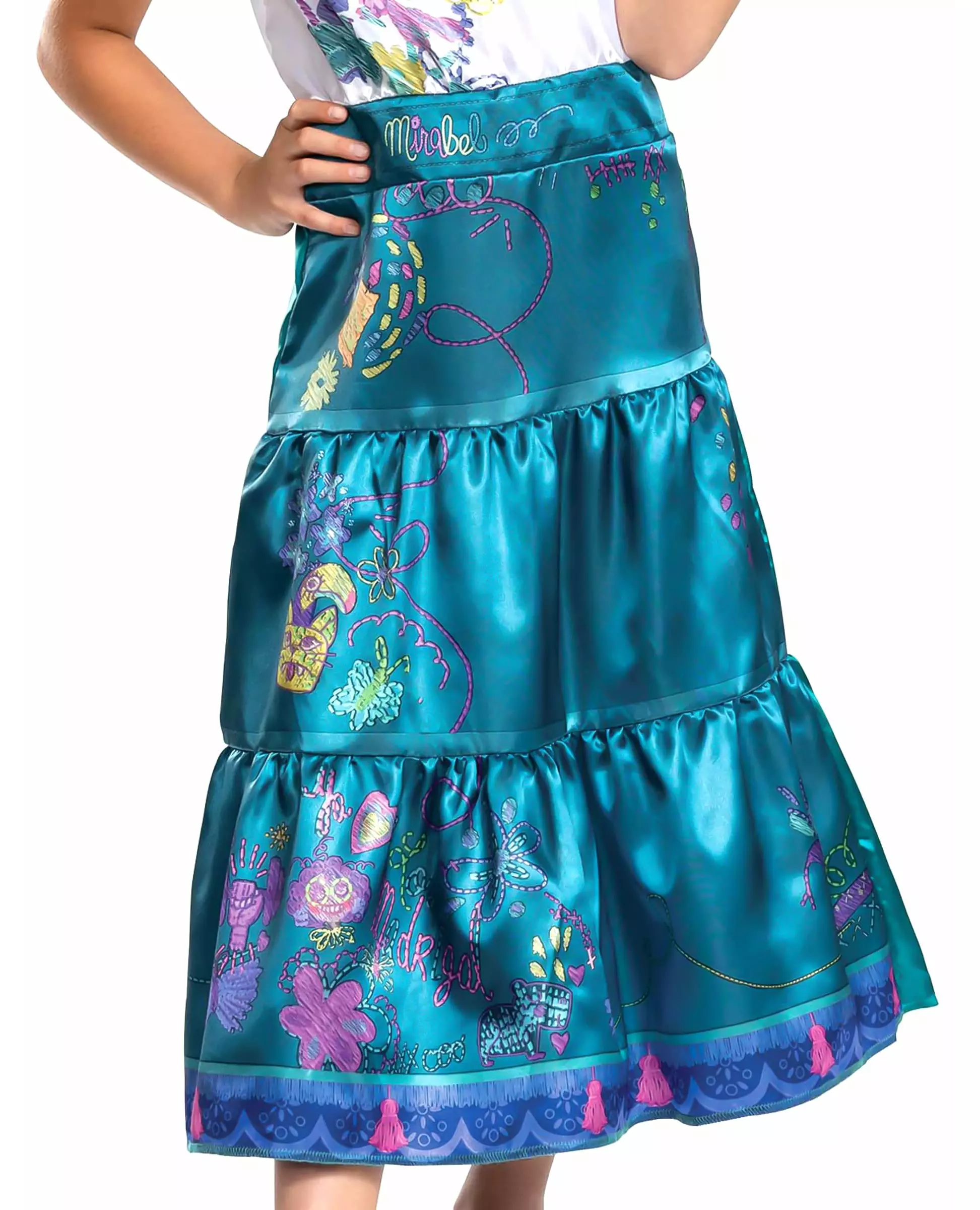 Play as Mirabel and discover a magical world This deluxe Mirabel costume is for girls. It is officially licensed by Disney™ and includes a dress. The top of the dress has short sleeves and is lined with a boat neck. The boat neck is printed with pretty black butterflies all around. A small pink bow is also sewn on one side of the neck. The lower part of this long dress is made from a pretty duck blue satin fabric with pretty colorful Mexican prints. A Mirabel costume, from the Disney™ Encanto cartoon that will delight your daughter for Carnival or a fancy dress birthday party. on the theme of Disney characters. Accessories included: Dress Material: 100% polyester Care: Hand wash