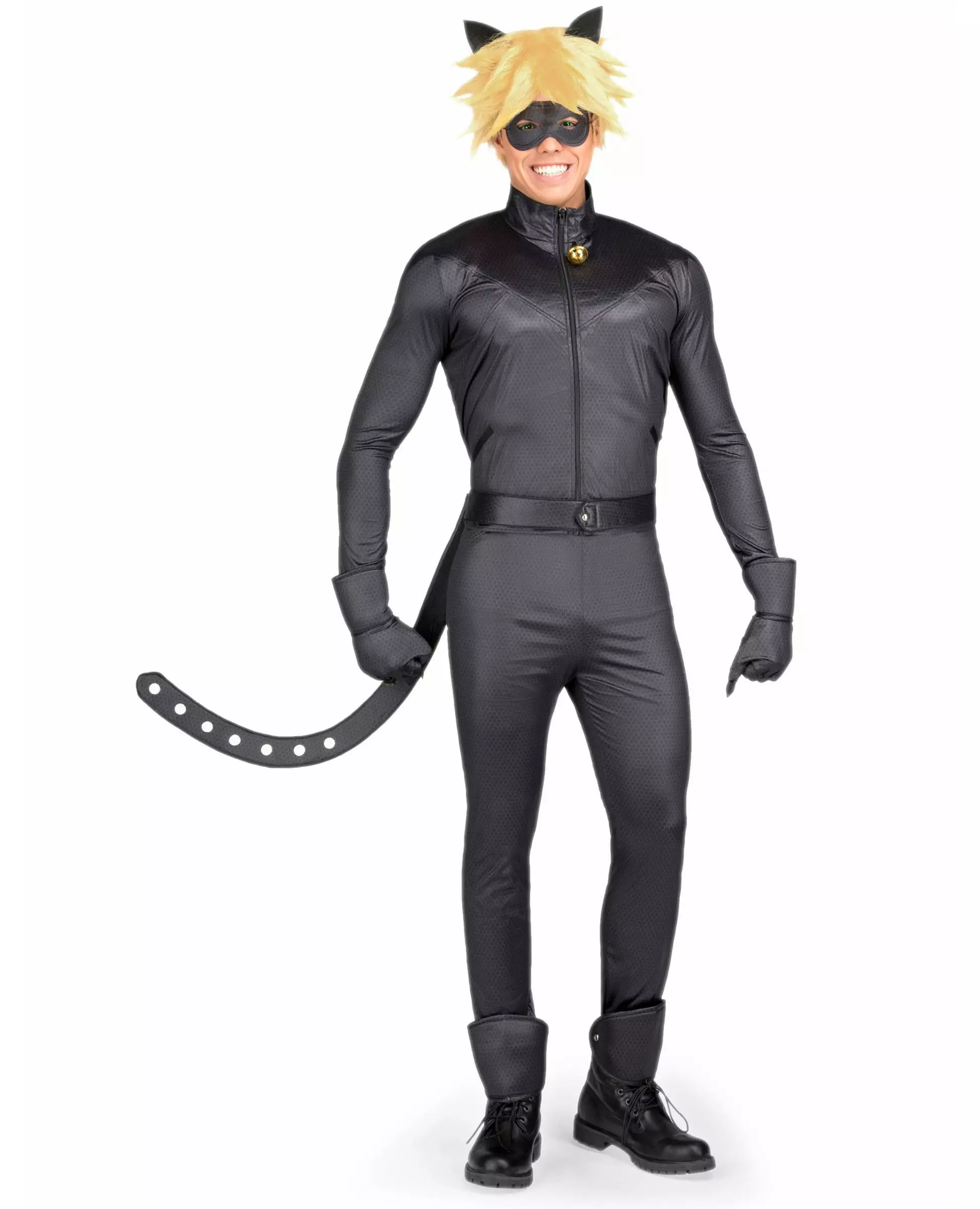 Supervillains better watch out! This officially licensed Miraculous Cat Noir adult set includes a jumpsuit, mask, gloves, belt, and wig. The skin-tight black jumpsuit has a zipper closure at the front. The collar is raised at the neck and decorated with a bell. The outfit is completed with black gloves and a mask, as well as a belt that takes the form of a cat tail. A blonde wig with cat ears adds the finishing touch to the costume. Become your favorite hero with this costume. children for a costume party or carnival. Accessories included: Mask Belt Gloves Wig Jumpsuit Material: 100% polyester Care: Hand wash