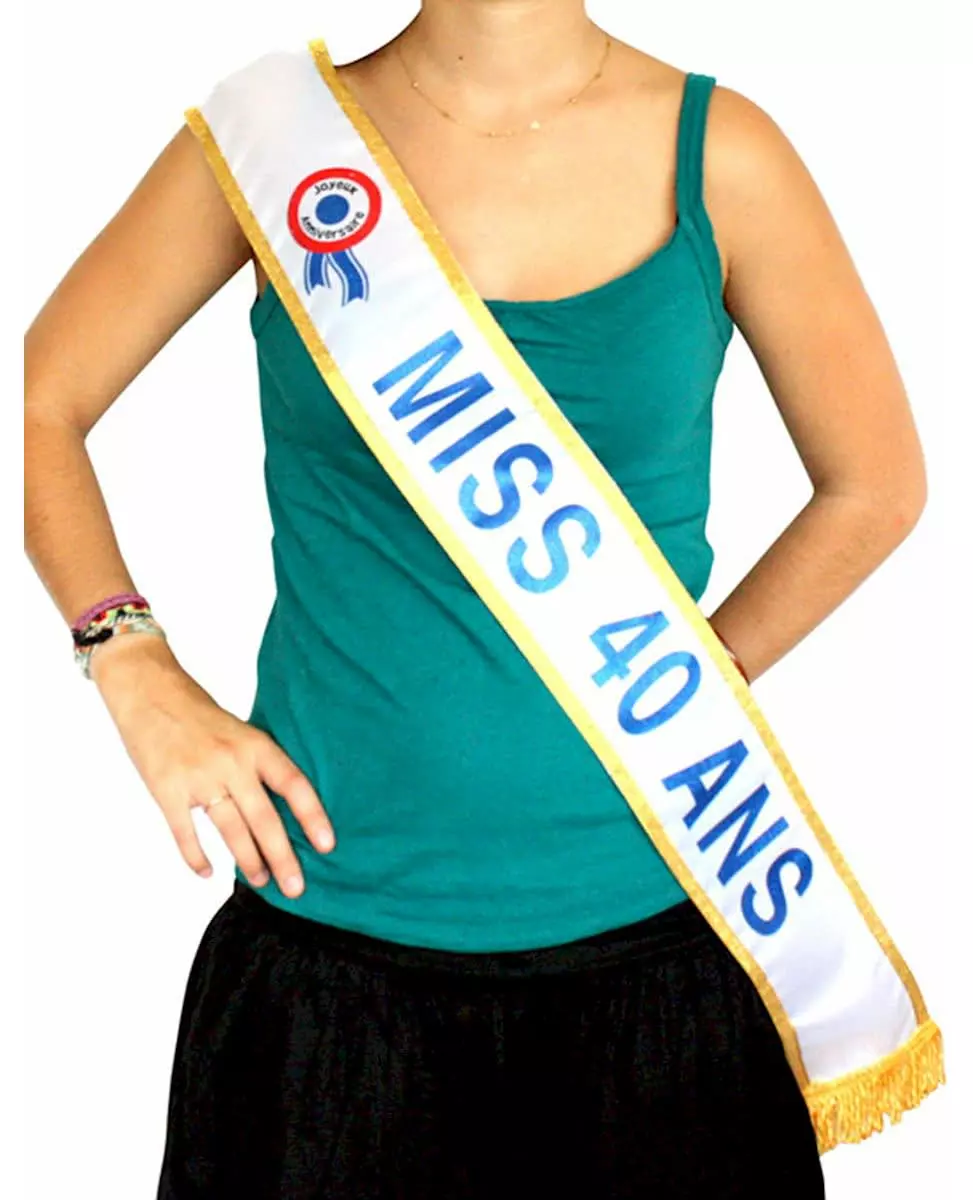 This women's sash is made of white fabric with gold trim and the words "Miss 40 Years" in blue glitter. The sash measures approximately 184 cm in length. It will be perfect for a birthday party.