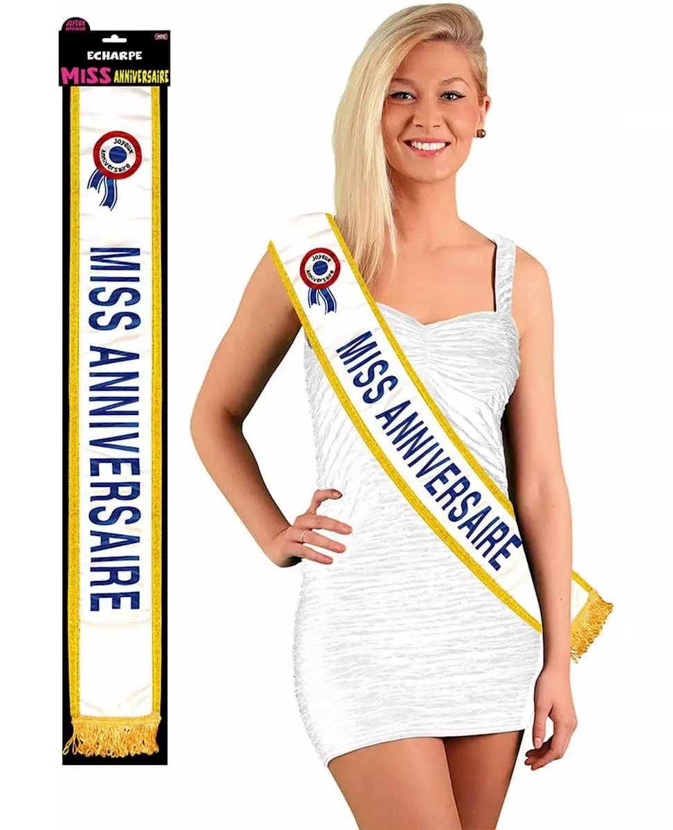 For a great time! This women's sash is made of white fabric with gold trim and the words "Miss Birthday" in blue glitter. The sash measures approximately 184 cm in length. It will be perfect for a birthday party.