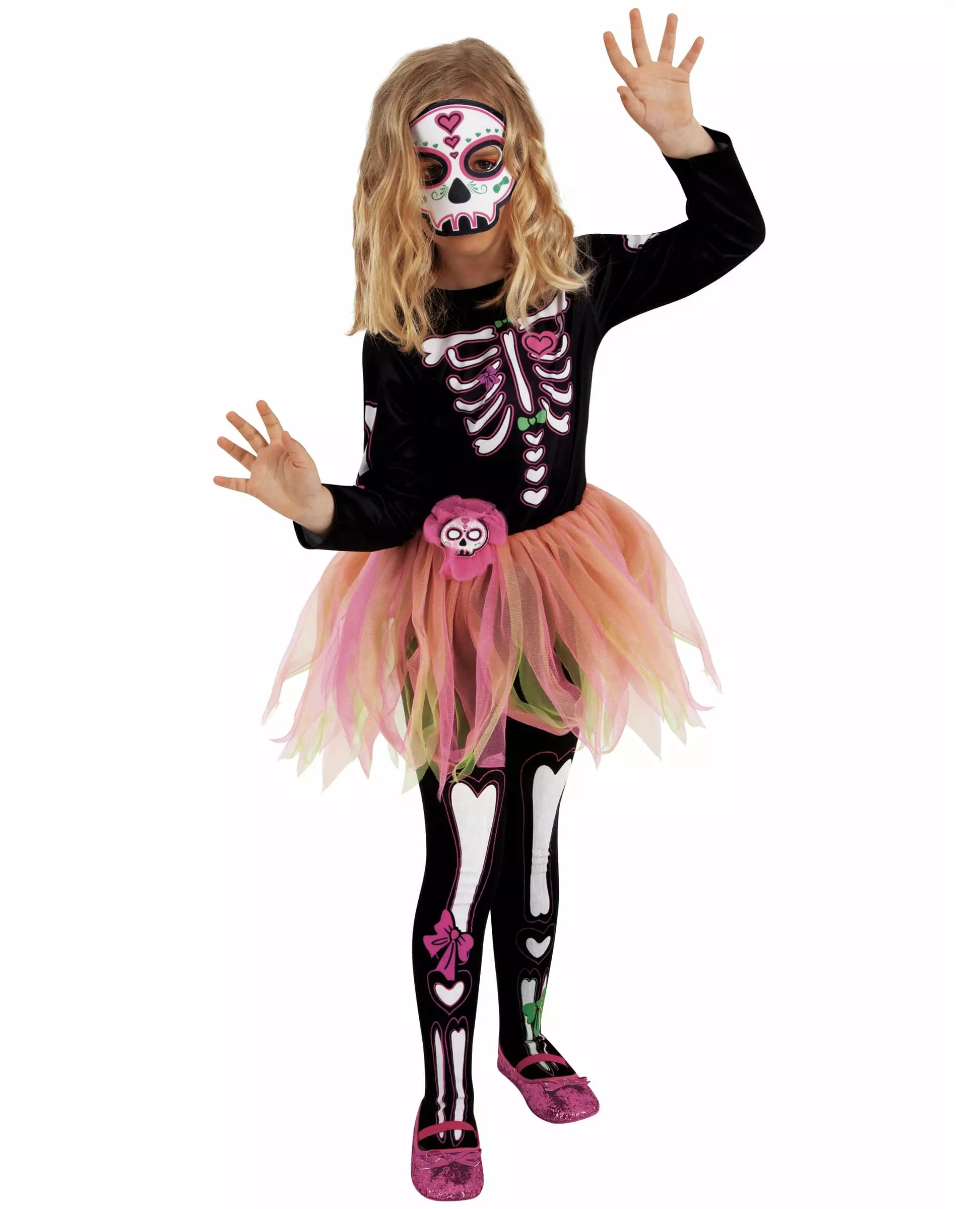 Miss Dia de los Muertos costume! This Miss Dia de los Muertos costume is made up of a top, a tutu, a mask, and a pair of tights (shoes not included). The black long-sleeved top is decorated with a white skeleton print. A multicolored tutu is added over this outfit. The tights decorated with a skeleton print match the t-shirt. Finally, you will find a half-mask that will complete this Miss Dia de los Muertos outfit perfectly! The Miss Dia de los Muertos costume is original and will be perfect for Halloween! Material: Fabric. Accessories included: Top Tutu Mask Tights Care: Hand wash