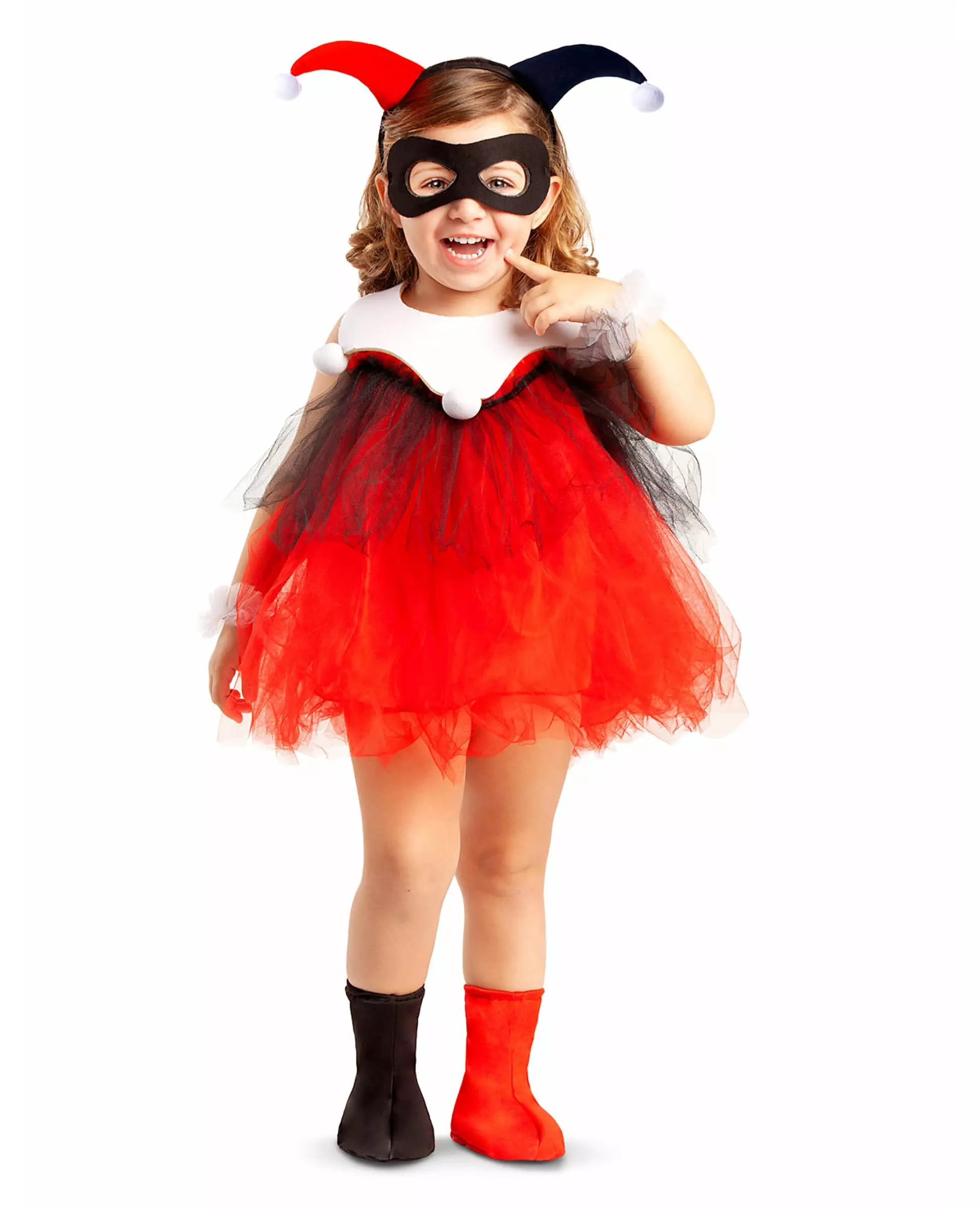 For Halloween, reveal your baby's super villain This Miss Harlequin costume for babies consists of a dress, a collar, a headband, a mask, a pair of bracelets and overshoes. The harlequin dress is short. It is topped with orange-red and black veils. A white collar will be placed over it. It is decorated with white pompoms. The headband has a black tip and a red tip, with a white pompom at the end of each. The mask is a black wolf, which is worn using an elastic band. The bracelets are made of white veil, and are elastic. Finally, the overshoes represent short boots. One is black, and the other red. This costume will be perfect for changing baby into a famous super-villain for Halloween. Accessories included: Dress Collar Headband Wolf Bracelets Overshoes Material: 100% Polyester Care: Hand wash