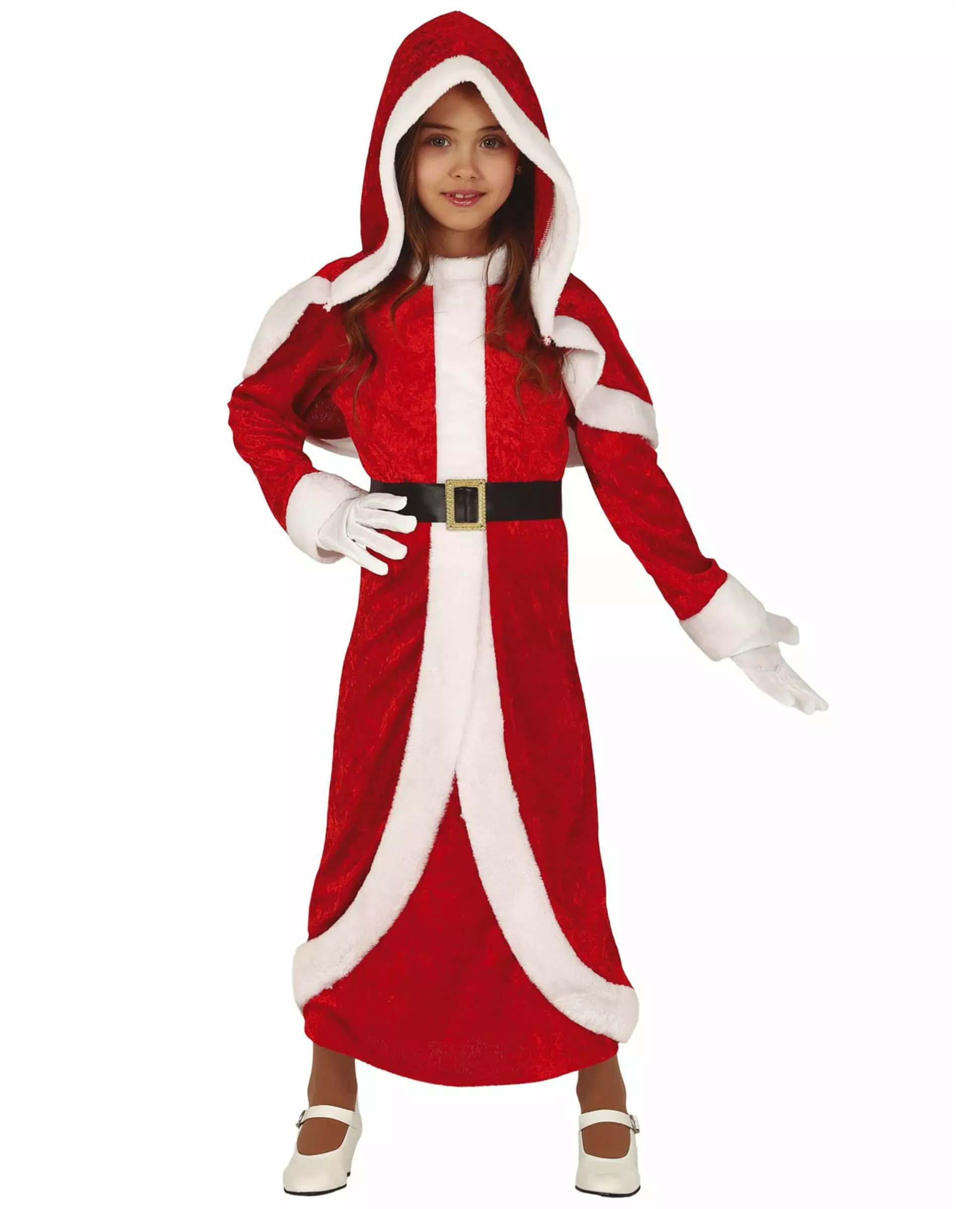 An adorable Mother Christmas! This Mother Christmas costume is for girls and consists of a dress, a cape and a belt. The long dress is red and has a velvet look. The sleeves are long and decorated with a white border at the wrists. The black belt with a gold buckle completes the costume. The cape is red and also has a velvet look. It is decorated with a white border. This Mother Christmas costume will be perfect for celebrating Christmas with your daughter! Material 100% polyester Care and washing Hand wash Accessories included Cape, dress, belt Safety Warning! Not suitable for children under 3 years. Contains small parts, choking hazard.
