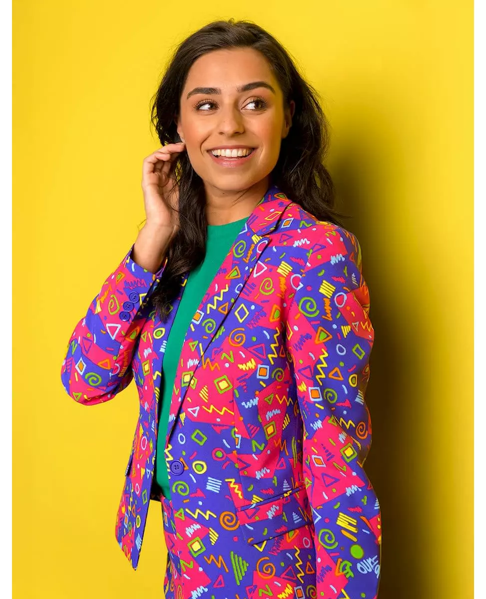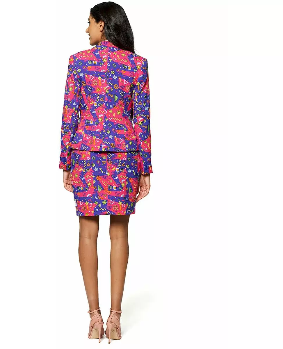 chic and quirky costume! This Mrs. Symbol costume for women is from the Opposuits™ brand. It consists of a jacket and a skirt. The suit jacket is cut from a quality purple and pink fabric, with various colorful festive symbols, green, yellow, pink and white. It has two false side pockets and closes with a button. The skirt matches the dress, with identical patterns. It is fitted and closes with an invisible zip. This colorful set will be perfect for a chic evening or for a colorful evening for example!. Accessories included: Jacket Skirt Material: Polyester Care: Hand wash
