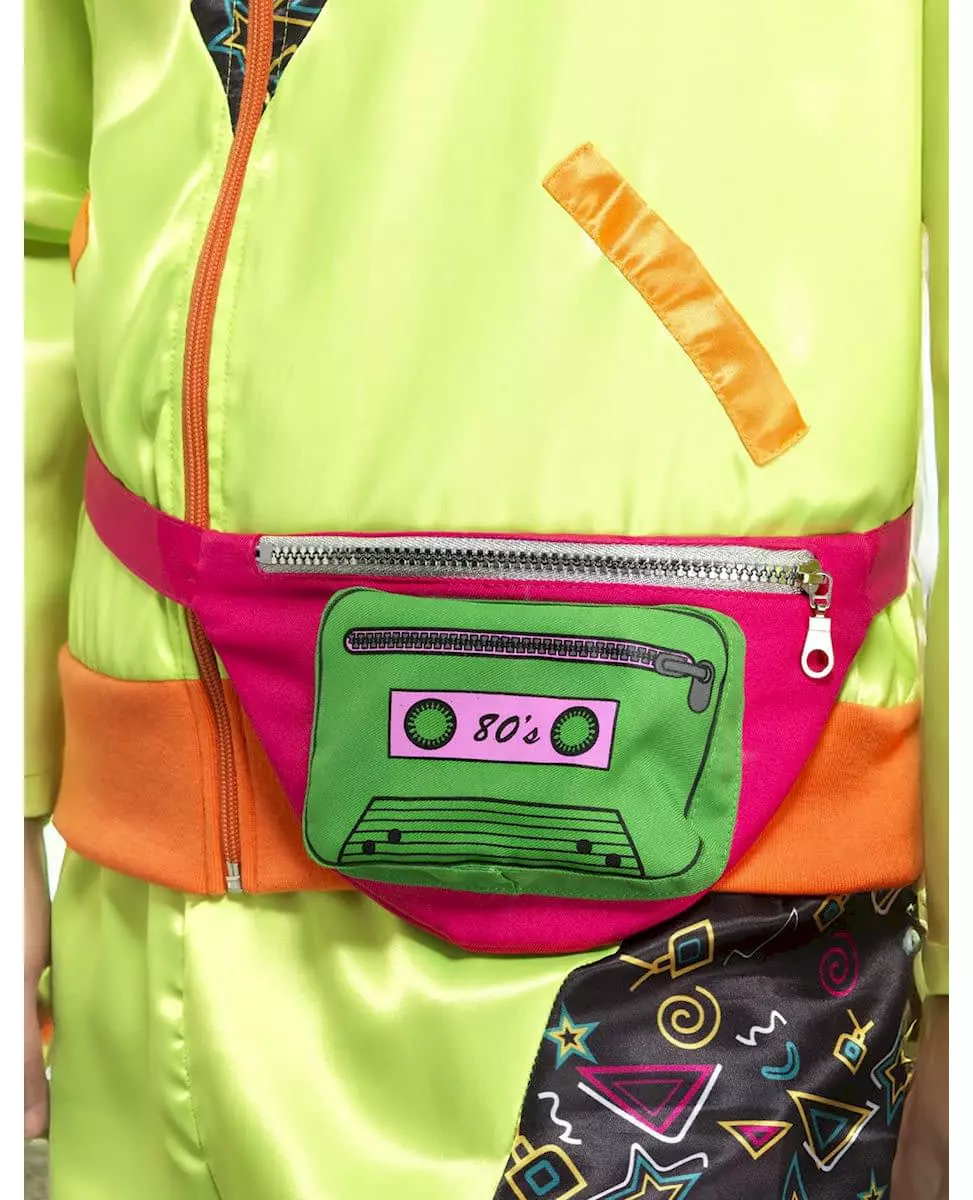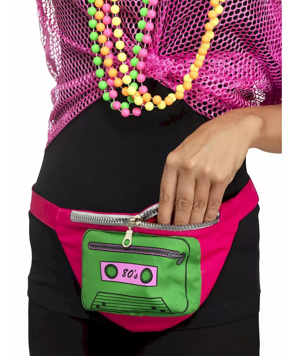 A great fanny pack! This fanny pack is multi-colored. It's pink and has a pretty green cassette print. The "80s" inscription is also present on the front. A zipper allows you to close the fanny pack. You can easily wear it around your waist. It will ideally complete an 80s-style outfit for a costume party! Accessories included: Fanny pack