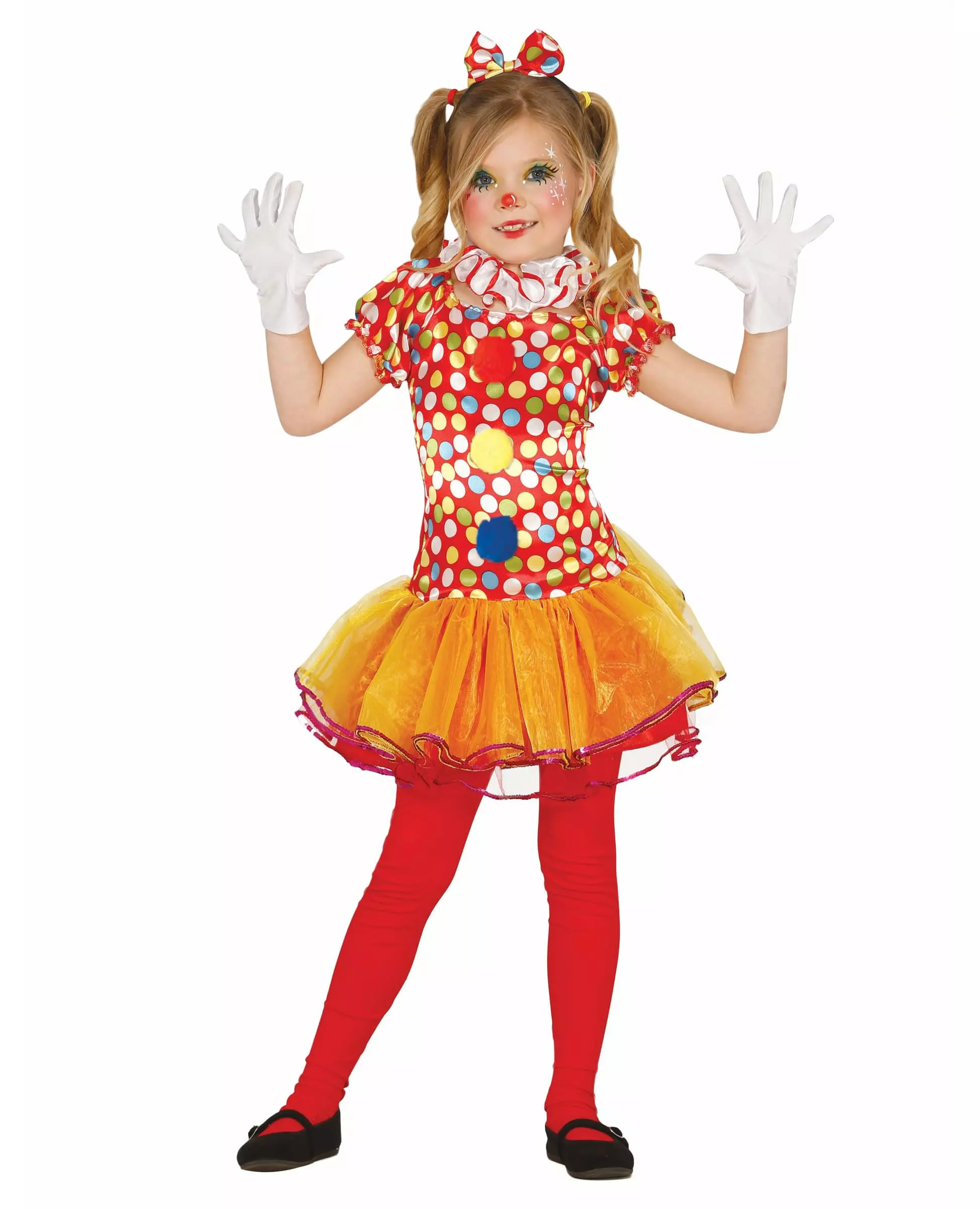 To make you laugh This clown costume is for girls and includes a dress, a collar and a headdress (tights, gloves, shoes and makeup not included). The dress is short and voluminous for the skirt part. The top is in shiny polka dot fabric on a red background, and the skirt is made up of 4 layers of yellow and red veils edged with pink sequins. Small red, yellow and blue pompoms are sewn to the front and the sleeves are short and puffy. The collar is white with red edging and will be Velcroed around the neck. Finally, the headband is topped with a pretty bow matching the whole. To play the cute circus clowns, this costume will be ideal for a show or for Carnival. Accessories included: Dress Collar Headband Material: 100% Polyester Care: Hand washable