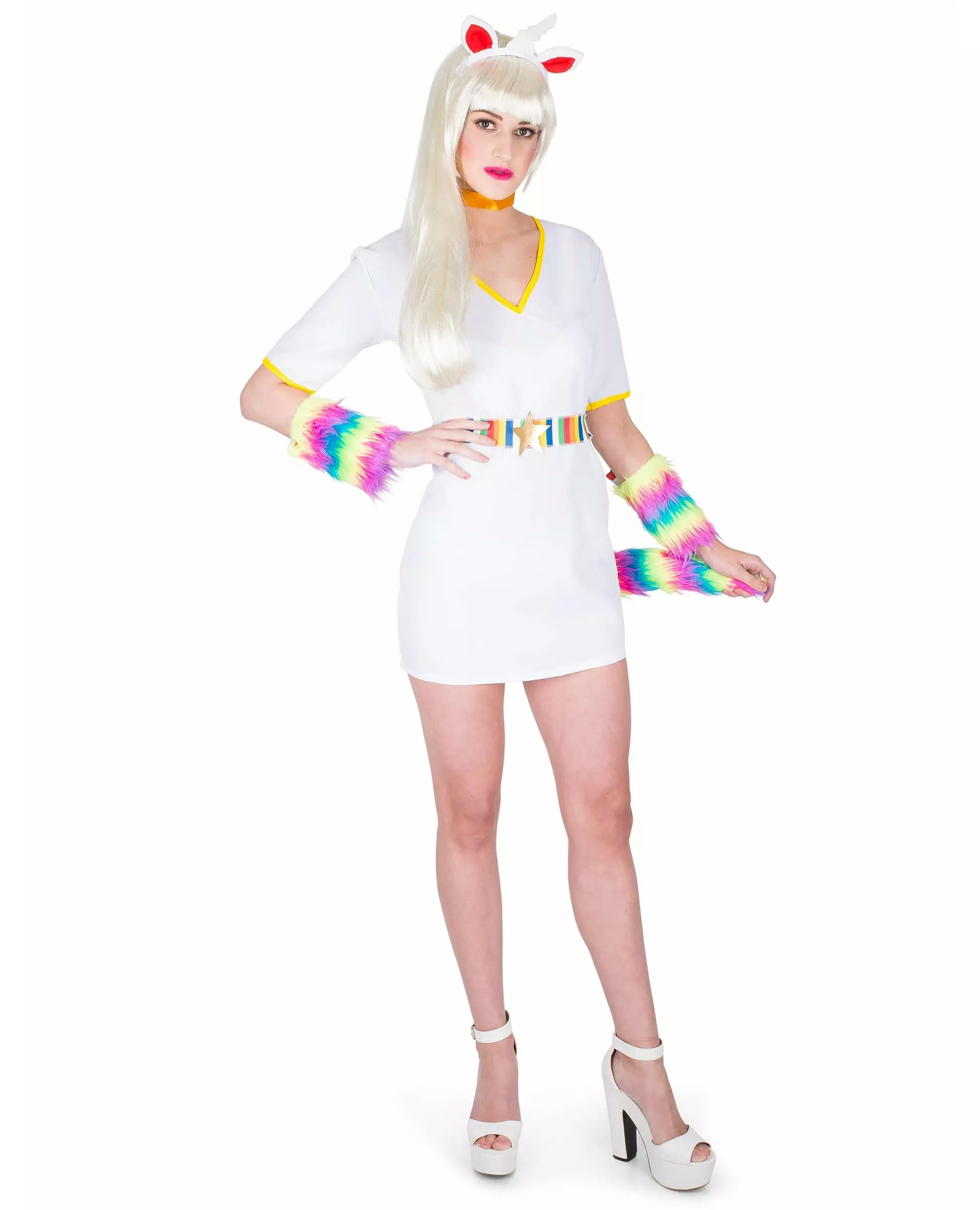 beautiful unicorn! This unicorn costume includes a dress, cuffs, a choker, and a headband (shoes are not included). The white dress has short sleeves and thin yellow stripes on the collar and sleeves. Multicolored striped cuffs, a belt, and a tail, as well as a yellow choker, complete the outfit. And to finish, a white headband is topped with a horn and two ears. This women's set will be perfect for a costume party with friends!. Accessories included: Dress Cuffs Choker Headband Material: 100% Polyester Care: Hand wash