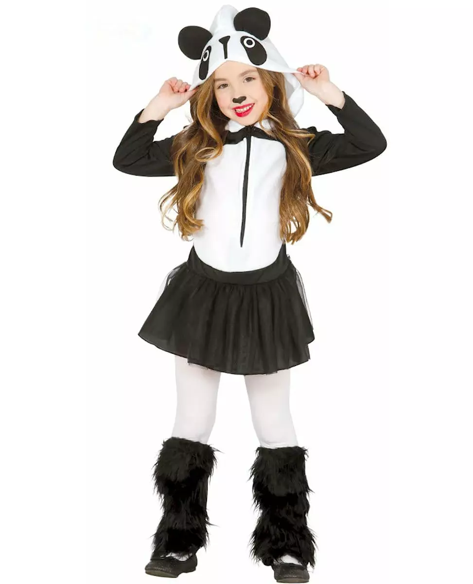 The panda costume, a Carnival essential This panda costume for girls consists of a dress and a pair of leg warmers (tights not included). The dress is black with a white belly. It has a hood to represent a panda's head. This hood is white with black ears, as well as eyes and a nose. The lower part of the dress is decorated with a black veil, to imitate a tutu. The leg warmers are made of black synthetic hair. This panda costume will be perfect for Carnival or a party. Animal theme.. Accessories included: Hooded dress 2 Leg warmers Material: 100% polyester Care: Hand wash