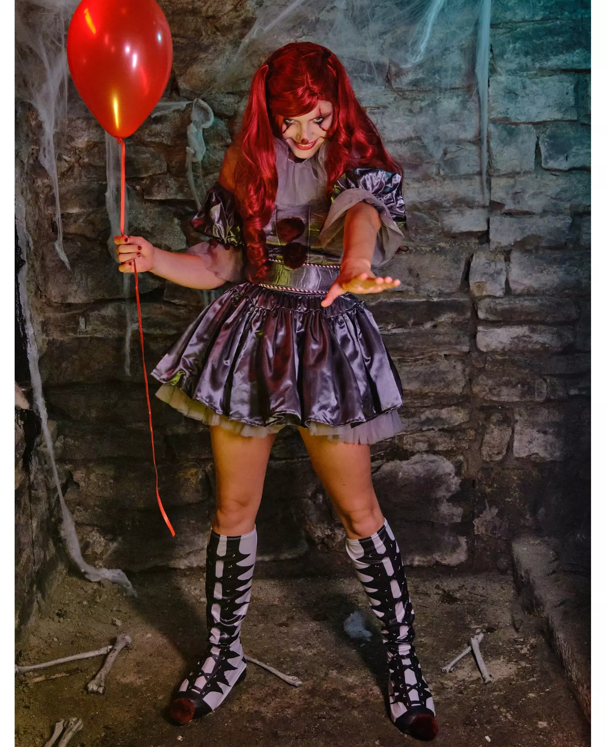 Embody the terrifying It for Halloween! This women's costume is officially licensed by Ca™. It consists of a dress, a pair of stockings, a collar, and cuffs. The gray dress is tightened at the top with two red plush pompoms sewn at the bust. The bottom of this dress is made of puffy light gray tulle over which is layered a satin skirt, also frilly. The satin cuffs decorated with tulle will perfectly complete this terrifying clown costume. A puffy gray tulle collar will add an even more realistic touch to your outfit. Finally, you will find red and black stockings reaching up to the knees. This costume will be perfect to embody the famous Pennywise during Halloween for example. Accessories included: Dress with cuffs, Collar, Stockings, Material: Polyester,