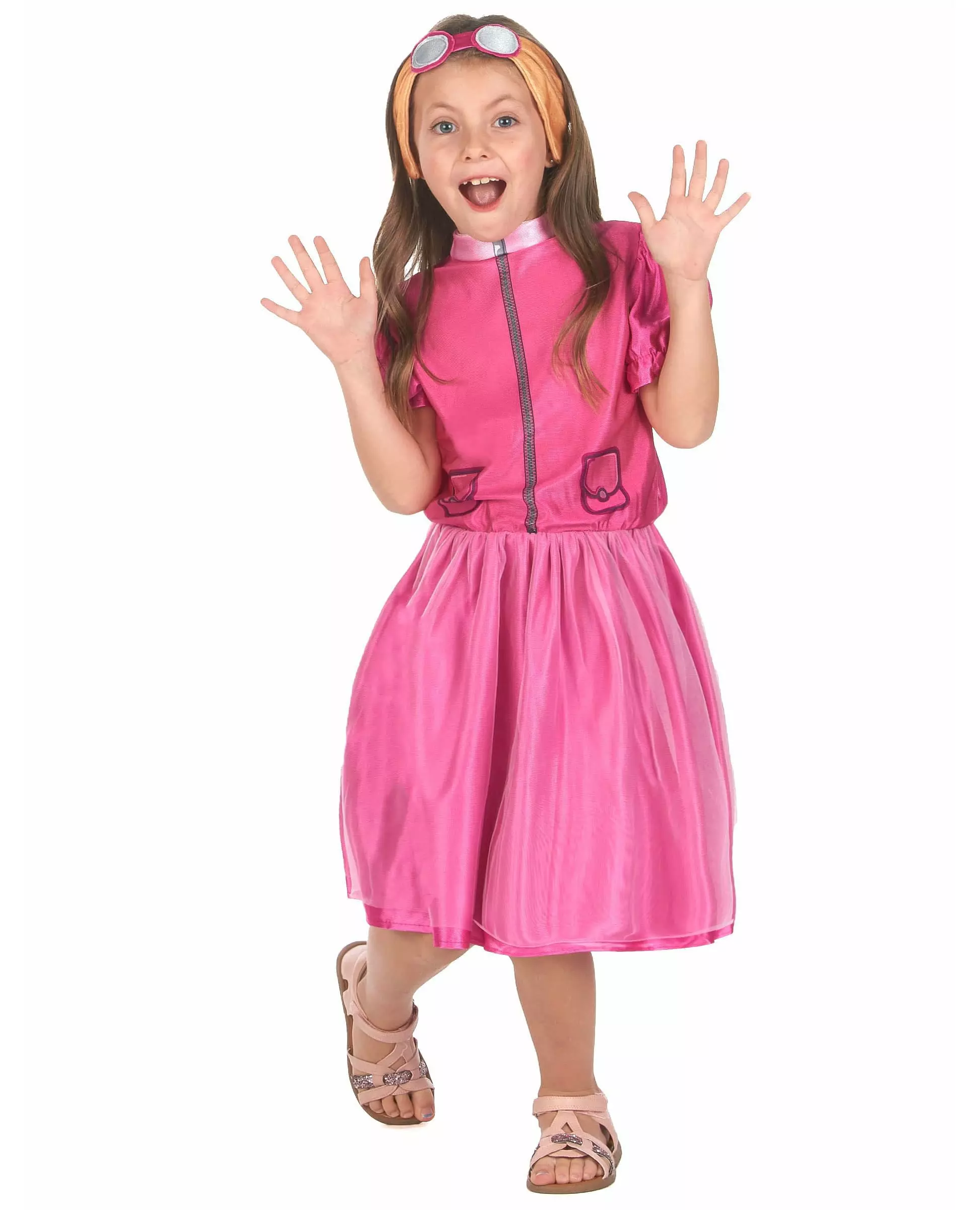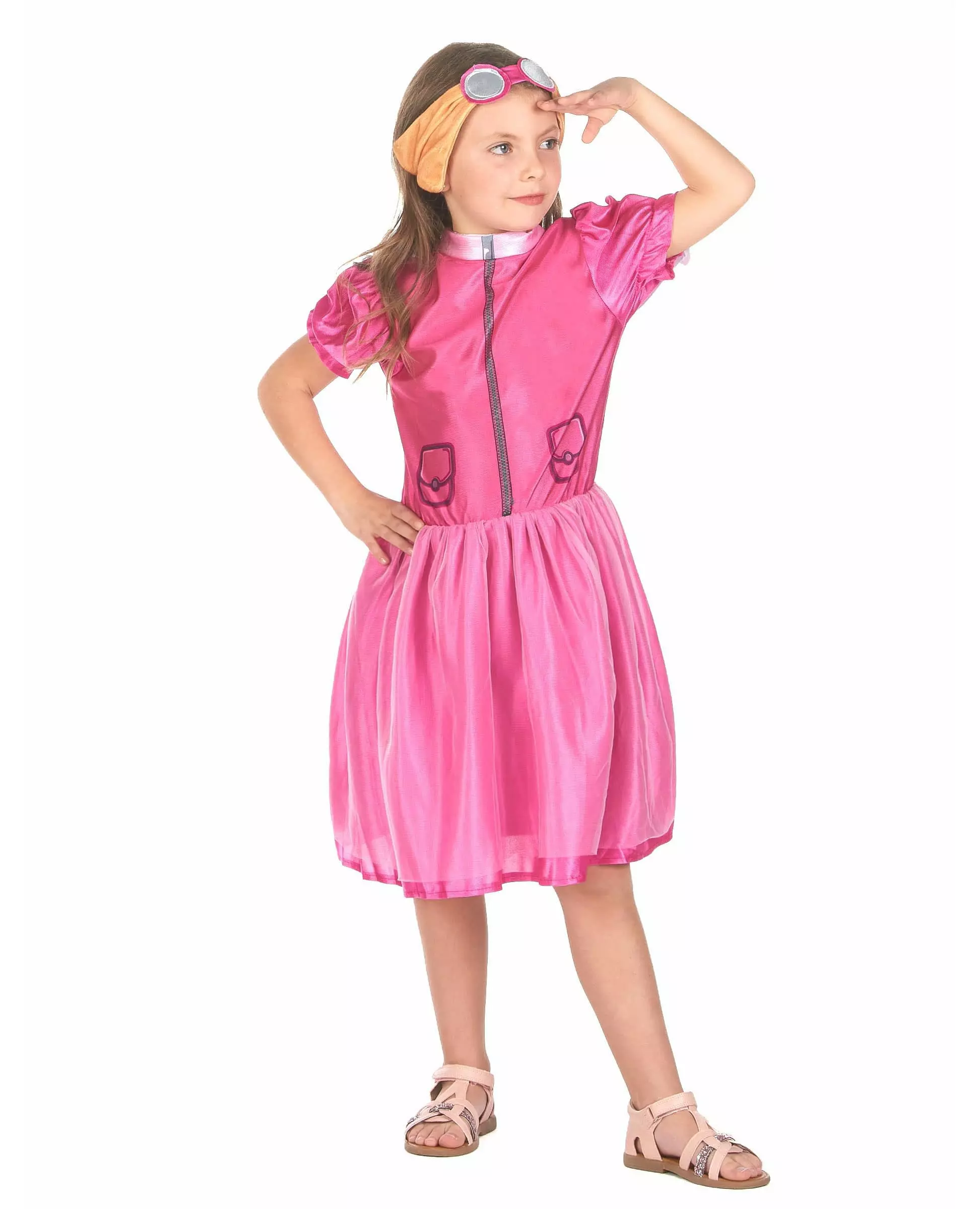 Sky aviation specialist! This pink aviator dog costume is for girls. It includes a dress and a headpiece. The short-sleeved dress is pink. It is printed with fake pockets, a fake central zipper, and a collar. It also has a thin, transparent veil that will be highlighted over the dress. It will be decorated with a small pair of white wings on the back. The headpiece represents the aviation goggles of the famous pilot from children's favorite cartoon! Play as your favorite heroine at your child's birthday party or at Carnival! Accessories included: Dress Headpiece Material: 100% Polyester Care: Hand wash