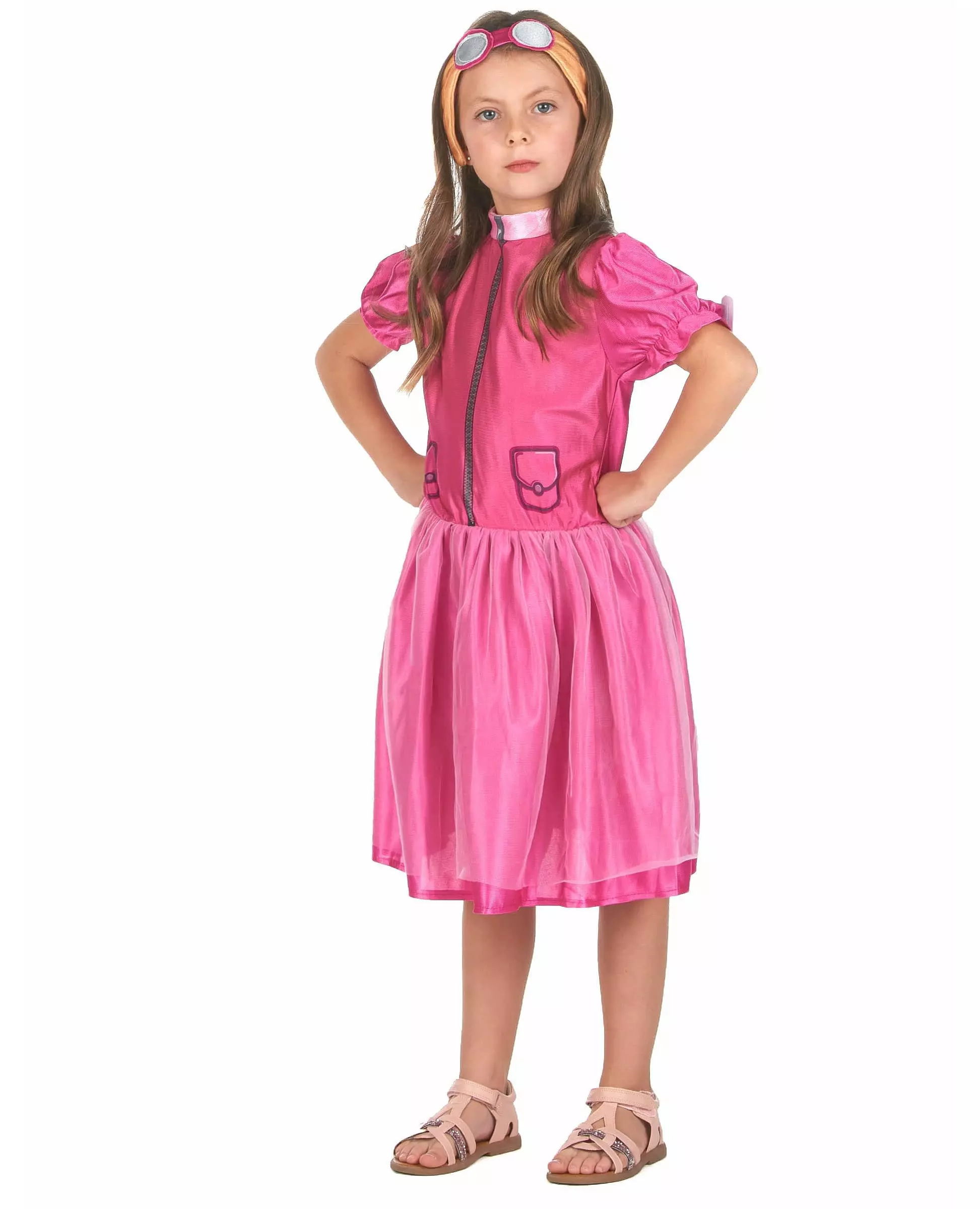 Sky aviation specialist! This pink aviator dog costume is for girls. It includes a dress and a headpiece. The short-sleeved dress is pink. It is printed with fake pockets, a fake central zipper, and a collar. It also has a thin, transparent veil that will be highlighted over the dress. It will be decorated with a small pair of white wings on the back. The headpiece represents the aviation goggles of the famous pilot from children's favorite cartoon! Play as your favorite heroine at your child's birthday party or at Carnival! Accessories included: Dress Headpiece Material: 100% Polyester Care: Hand wash