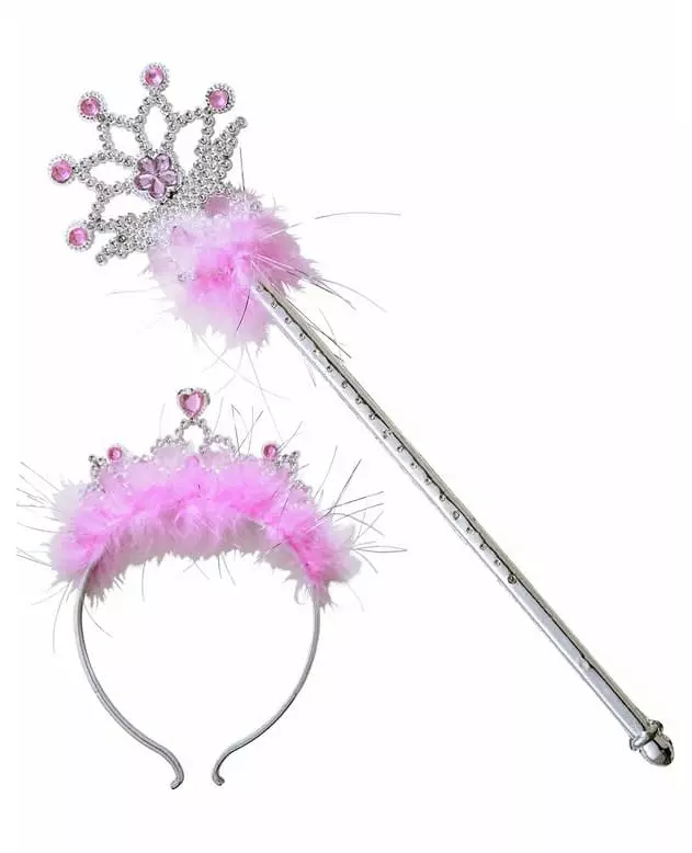 The complete kit for the perfect little princess This princess kit contains a wand and a tiara. The wand measures approximately 33 cm and is silver. Topped with a flower, the tips are decorated with fake pink stones. The tiara will sit on the head like a headband. The shapes on the top are reminiscent of the wand. Over a length of approximately fifteen centimeters, pink synthetic feathers have been glued on to give the item a magical feel. This little kit will be ideal for completing a princess costume for a birthday party. © Copyright Widmann SRL. Accessories included: Tiara Wand
