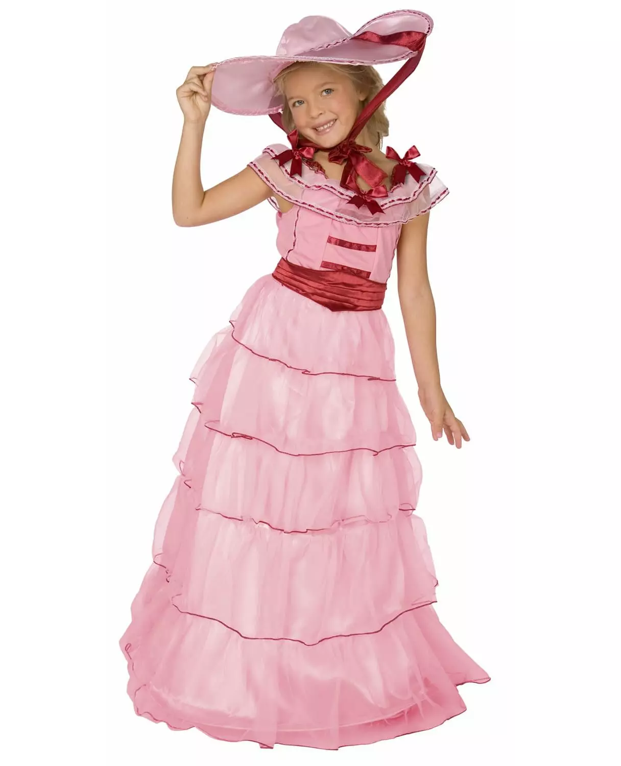 Southern Charmer This pink Southern lady costume for girls consists of a dress and a hat. The pink dress is long. It has several levels of tulle veils. Burgundy satin bows are attached to the top. In addition, a pretty satin ribbon matching the bows adds even more charm to this pretty Scarlett costume from the Civil War era. A pink hat with a burgundy ribbon also accessorizes this outfit. This pretty southern lady costume will be ideal for making your child the prettiest Scarlett at your American or Civil War themed fancy dress parties. Accessories included: Dress Hat Material: 100% polyester Care: Hand wash