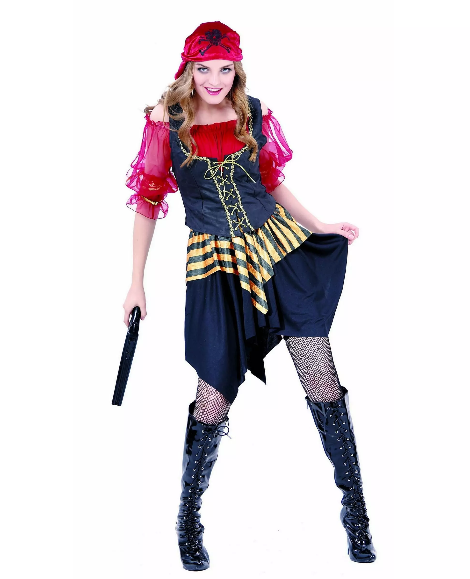 Complete costume! This pirate costume for women consists of a top, a vest, a skirt and a bandana (shoes, tights and accessories not included). The red top has tulle sleeves and gold ribbons are sewn at the ends. The black and yellow skirt is very elastic, it will adapt perfectly to your body shape. A black felt vest with a gold bodice will complement this outfit. A red bandana with a skull printed on the top will accessorize the outfit perfectly. This costume will be ideal to make you the most fantastic pirate during your evenings at theme.. Accessories included: Top Vest Skirt Bandana Material: 100% polyester Care: Hand wash