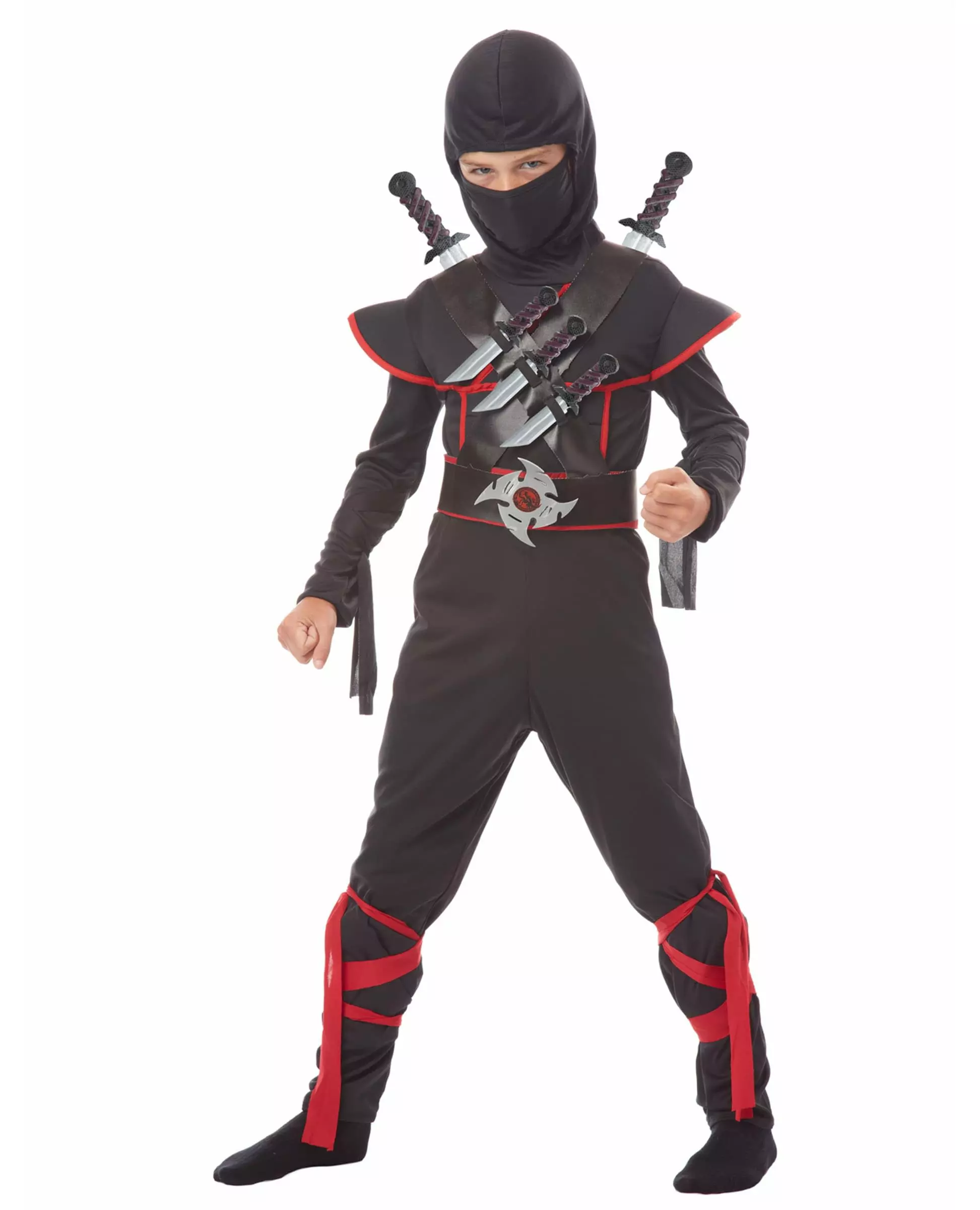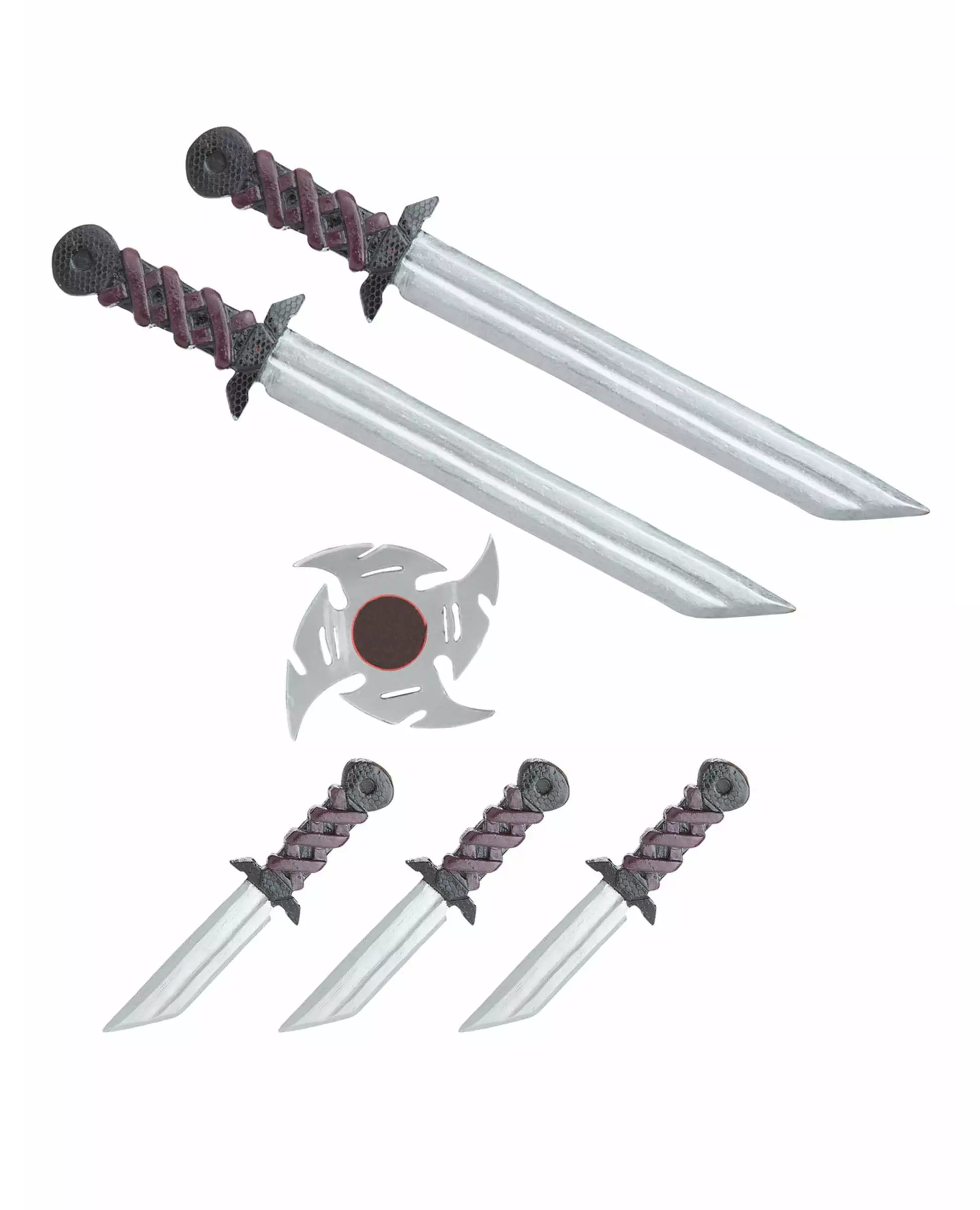 real ninja! This ninja weapons kit includes 3 daggers, 2 swords, a ninja star, and a belt to tie it all together. The plastic daggers and swords have a silver blade. Their handles are black with a burgundy grid pattern. The plastic ninja star is silver with a black center. The belt is leather-like. This outfit is perfect for being the ninja of the party. Accessories included: Two swords Three daggers Ninja star Belt