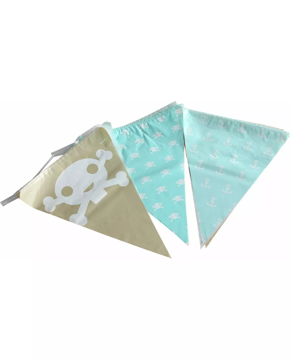 All aboard! This plastic Pirate garland measures approximately 270 cm long. It consists of turquoise blue triangular pennants decorated with small white skulls and beige pennants with a large skull in the center. This garland can be easily hung from the ends. It will fit perfectly into your pirate birthday decoration! Accessories included: 1 Garland Material: Plastic