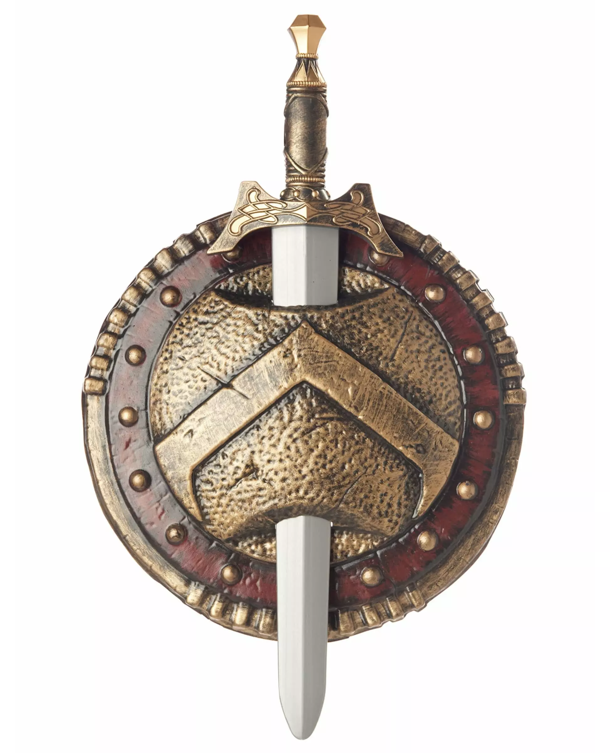 Feel like a Spartan! This set includes a plastic Spartan shield and sword. The shield is 30.5 cm in diameter. The exterior is brown, reminiscent of Spartan clothing. The center is gold. The sword handle is gold and the blade is silver. Awaken the Spartan in you for the next costume party. Accessories included: Sword Shield Material: Plastic