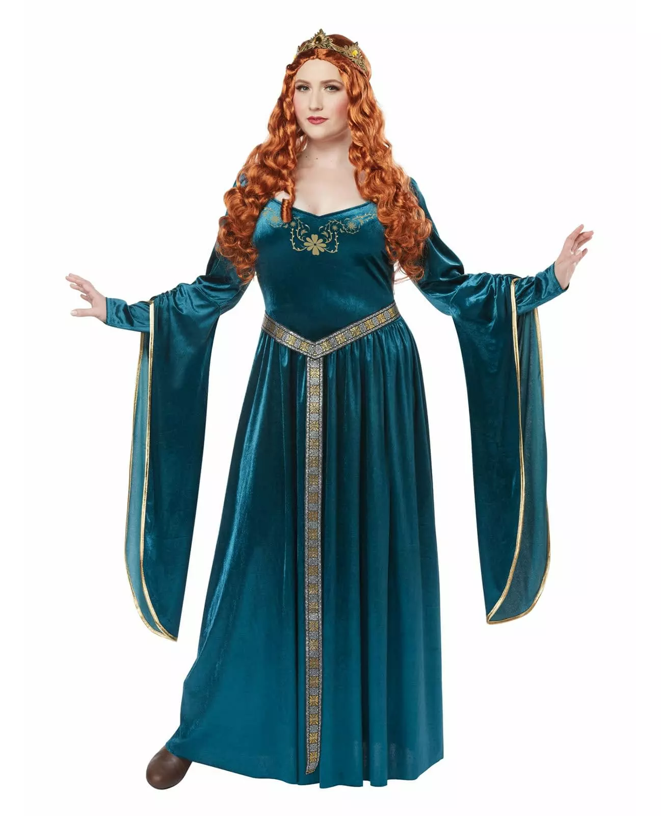 Damsel seeks knight This medieval princess costume for women includes a dress, a belt and a crown (wig and shoes not included). This petrol blue dress with a gold embroidered neckline goes down to the feet. It gives a fairytale princess look with its gold belt and long pagoda sleeves with gold trim. With this superb medieval long dress, you will dazzle the audience at medieval festivals. Accessories included: dress belt crown Material: 100% polyester Care: Hand wash