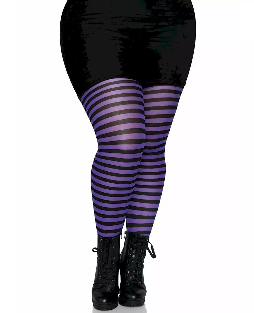 Complete your Halloween look with these tights! These plus size striped tights are for women. They are black and purple. These tights will be perfect to complete a witch and vampire costume or for a gothic look at a Halloween party. Accessories included: Tights Material: 50% Polyamide 50% Polyester Care: Hand wash