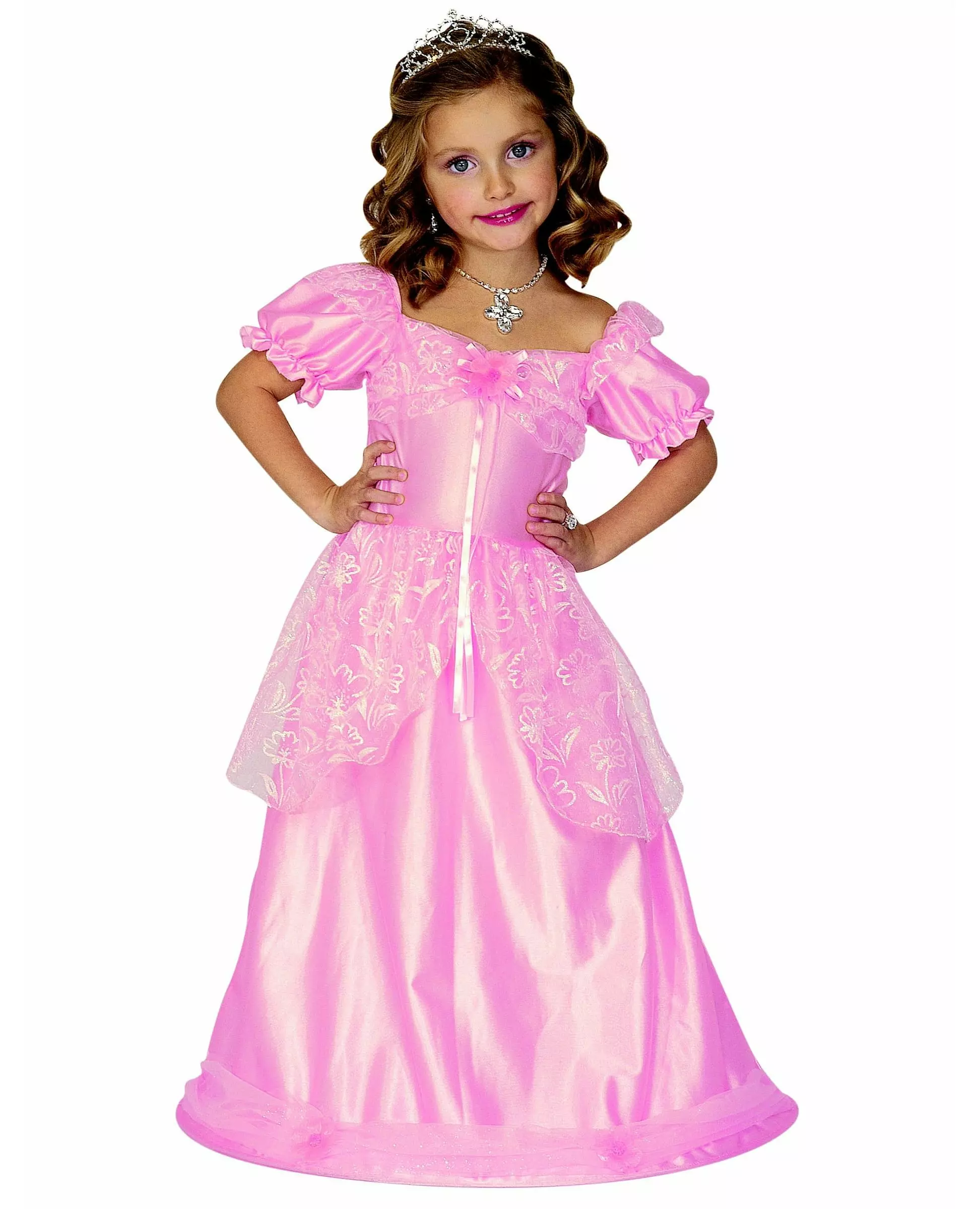 Puff sleeves and pink lace! This princess costume for girls consists of a satin pink dress decorated with gold trim and fitted with short puff sleeves. A hoop at the bottom of the dress will allow it to keep all its volume. (Crown and jewels not included). Covered with veils and lace, this costume will be ideal to make your daughter the prettiest princess for Carnival, a show or any other fancy dress event. © Copyright Widmann SRLMaterial 100% Polyester Care and washing Dry clean Accessories included - Dress