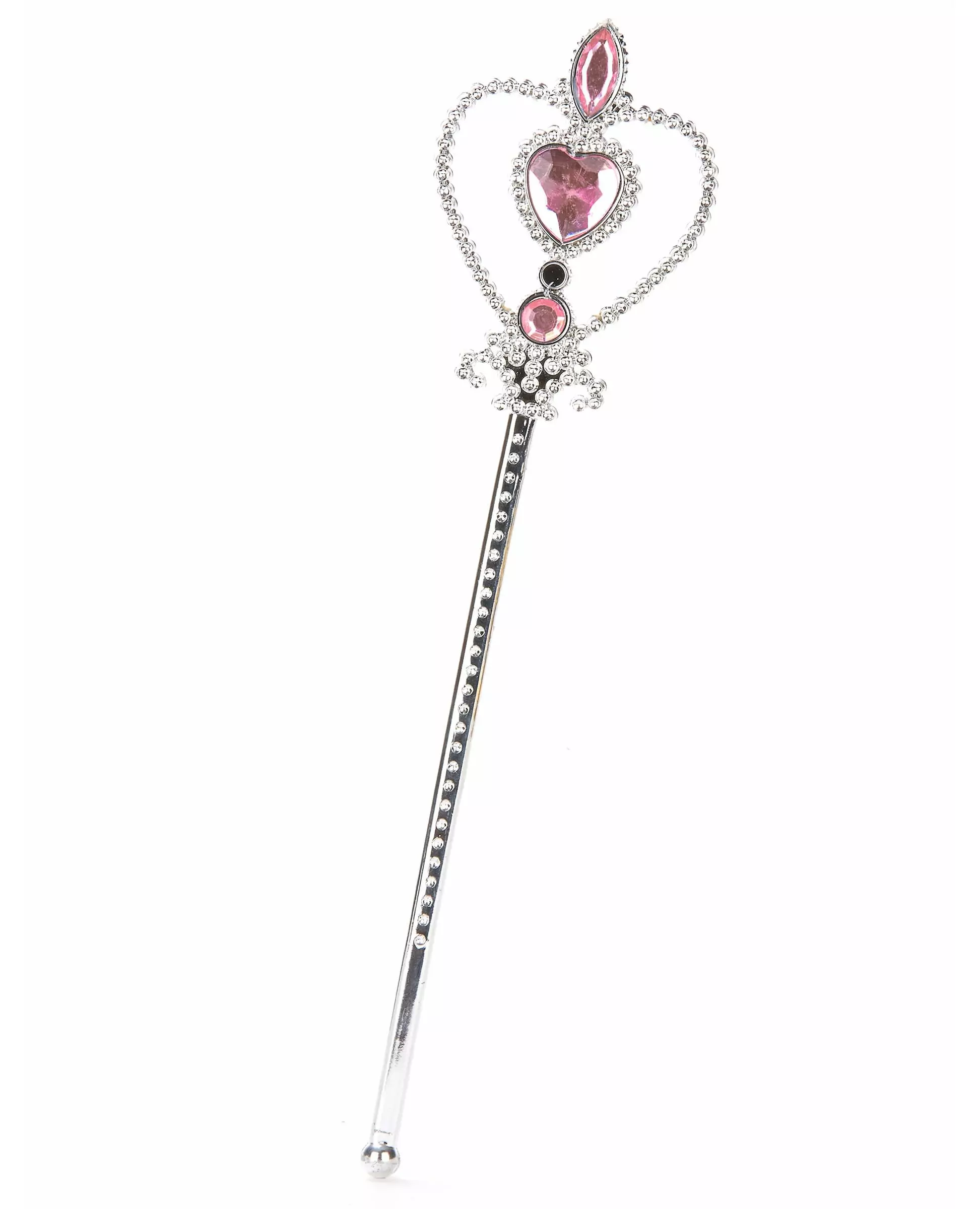 Silver This princess wand is silver in color and made of plastic. Its upper part is heart-shaped with light pink faux stones. It will be the essential accessory to complete your princess or fairy costume for Carnival or a show!. Accessories included: Princess wand Material: Plastic