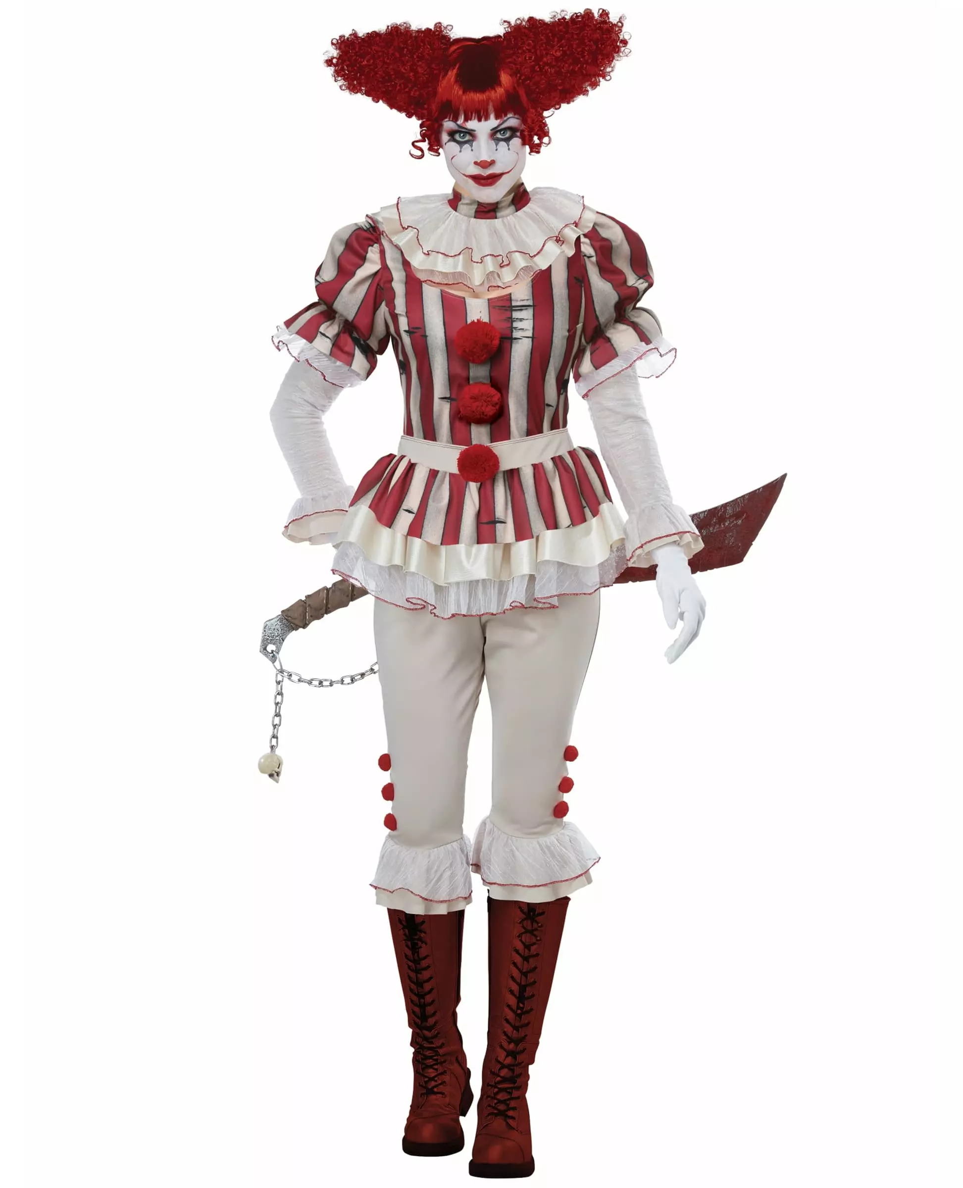 Psycho clown costume for women Psycho clown. This psycho clown costume is for women and consists of a shirt, trousers, a petticoat and a necklace. Adult costume includes: Shirt, Trousers, Petticoat, Necklace.