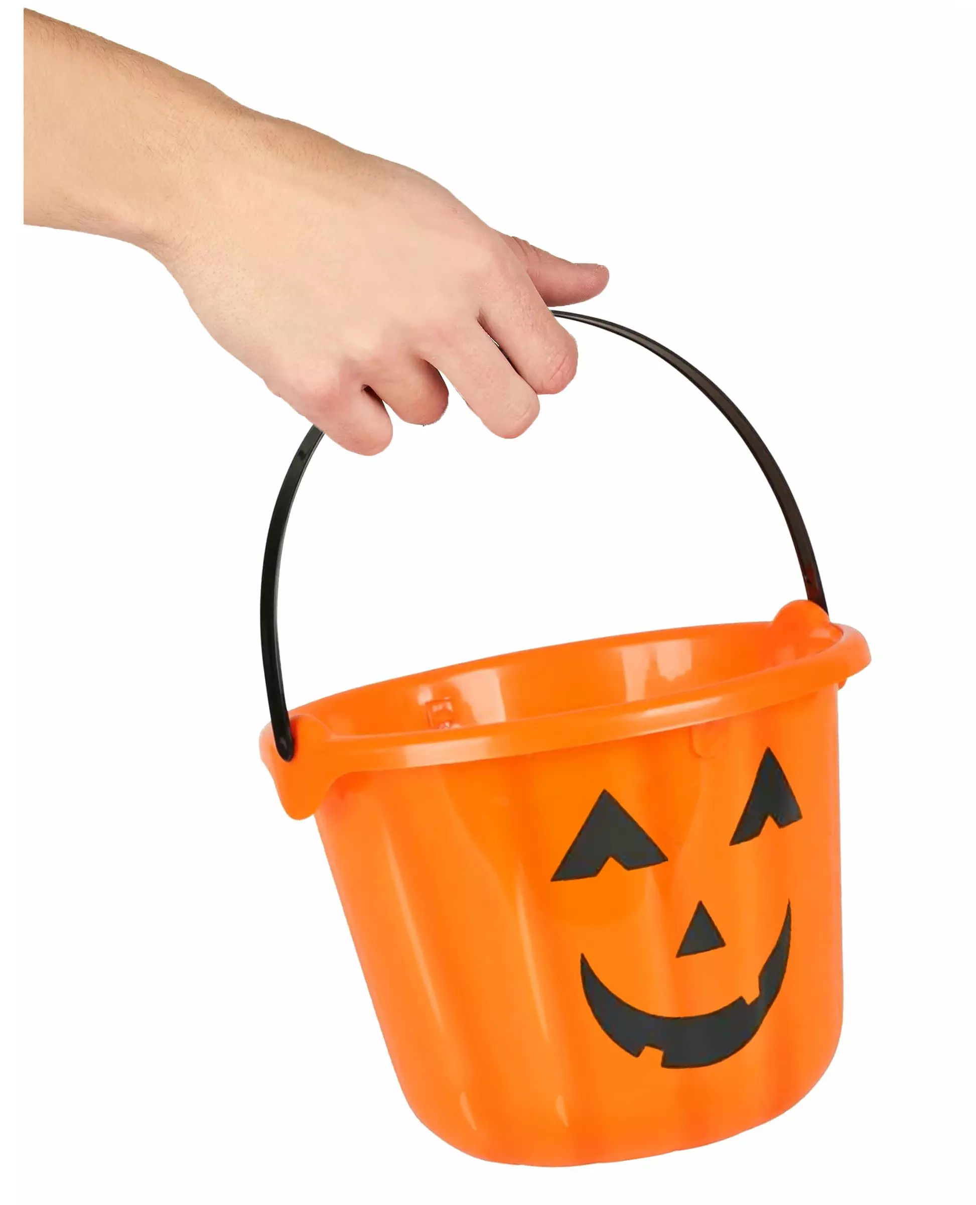 Pumpkin Head! This orange and black pumpkin bucket includes a handle to hold it in your hand. The container is rectangular and made of plastic. It measures approximately 23 cm in height and 17 cm in diameter. It will be perfect for going on a trick-or-treat on Halloween night. Accessories included: Bucket Material: Plastic