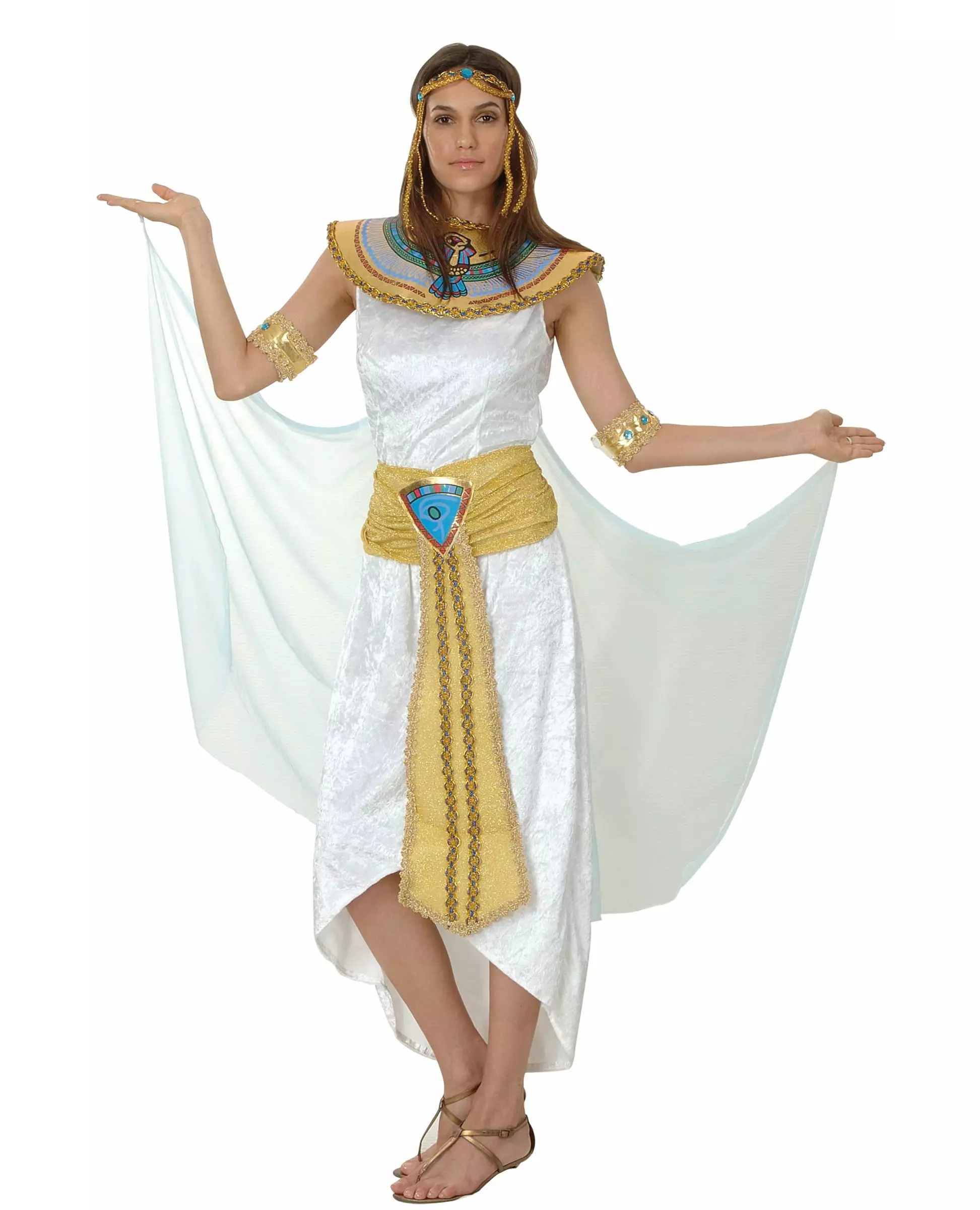Complete set! This Egyptian queen costume for women consists of a dress with veil, a ruff, a headband, two armbands and a belt. The dress is long and light, with a velvet look, there is a Velcro at the top of the back to secure the veil. It is easy to put on, without closure. The ruff and the belt tie at the back to adjust the size. The headband is put on with an elastic band to stay fixed on the head and the two armbands are attached with Velcro. The accessories are embroidered, the plastic diamonds are sewn on making the whole thing sparkle. This Egyptian queen costume is perfect for playing an authentic Egyptian queen at fancy dress parties. All that's missing are the pyramids and sphinxes to take you back to the time of the Pharaohs. Accessories included: Dress Collar Headbands Armbands Belt Material: 100% Polyester Care: Hand wash