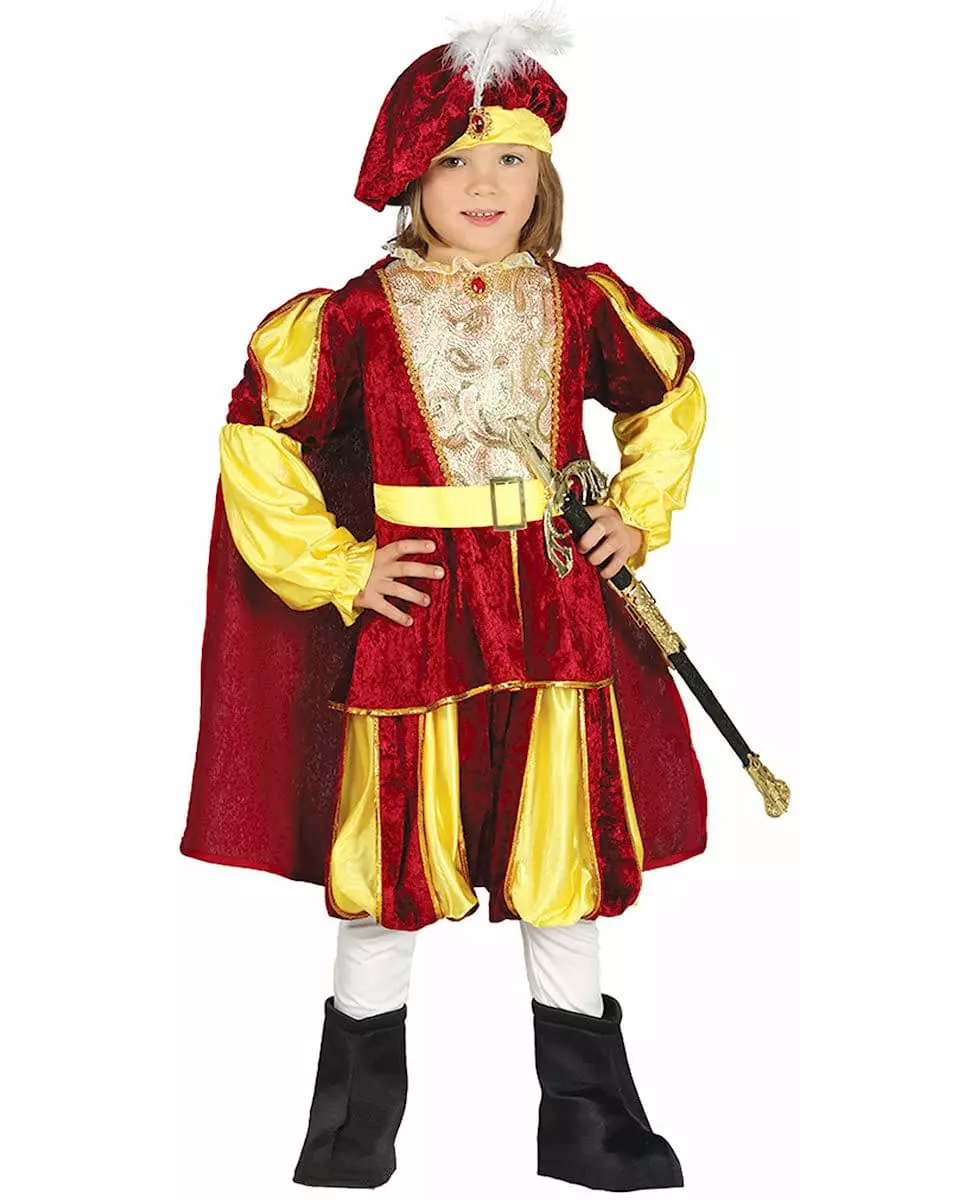 The King of the Carnival! This king costume for boys includes a hat, tunic, cape, belt, and shorts (sword, tights, and boot tops not included). The hat is a red velvet-look beret with a yellow velvet-look border at the base. On the front, it is decorated with a faux ruby topped with a faux white feather. The long-sleeved tunic is made of red velvet-look fabric with a band of gold brocade, edged with gold borders, in the center of the bust. A faux red gemstone decorates the collar of this tunic. The long sleeves are made of yellow velvet-look fabric, lined with short, puffed sleeves in red and yellow stripes. A yellow belt with a rectangular gold buckle cinches this tunic at the waist. The mid-length cape is also made of red velvet-look fabric. The short pants are wide and tightened at the knees for a realistic and puffy medieval style! This complete, high-quality costume is ideal for transforming your son into the king of your costume parties or Carnival. Accessories included: Hat, Tunic, Cape, Pants Material: Polyester Care: Hand wash