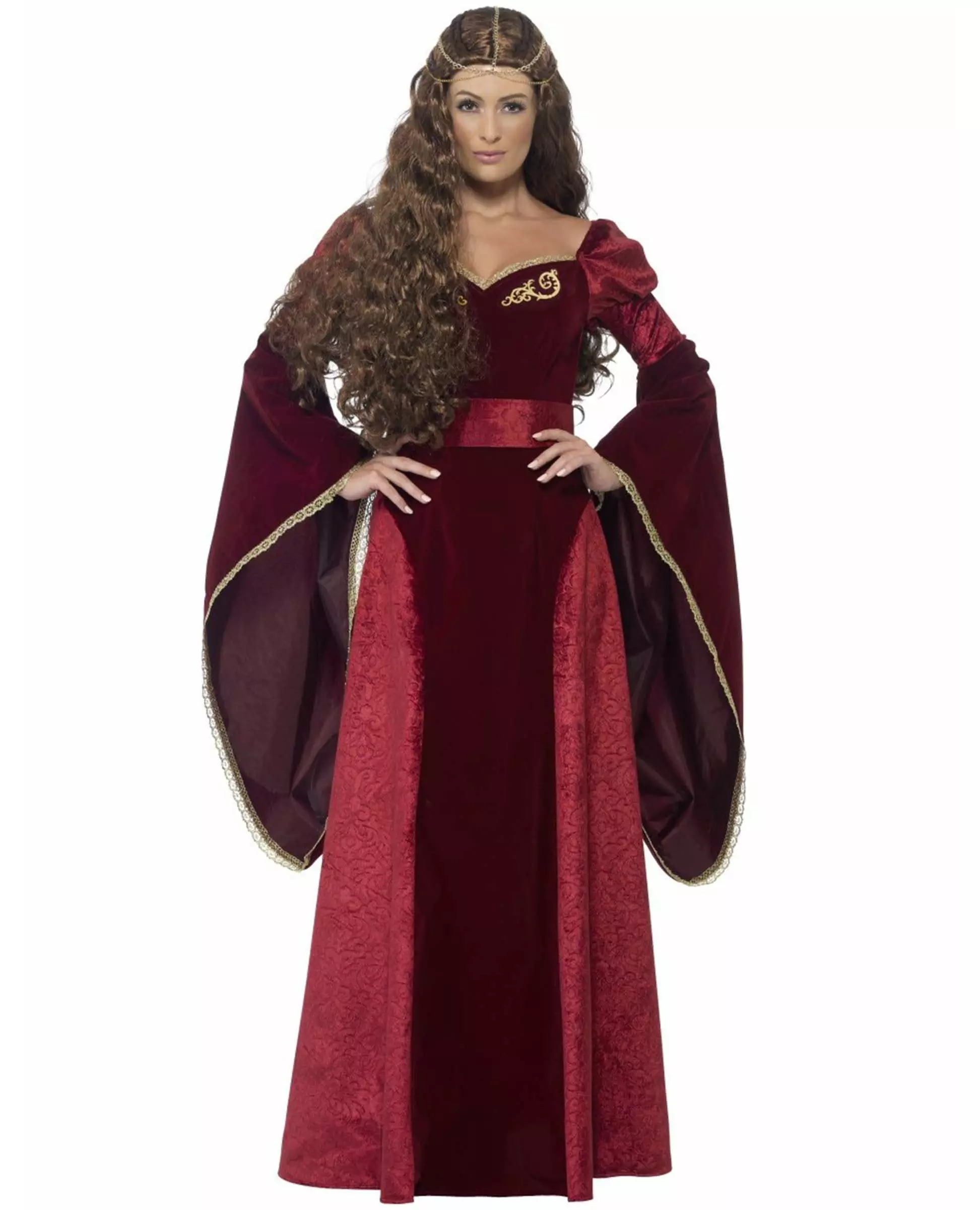 Become queen of the kingdom for a fancy dress party. This red medieval queen costume for women consists of a dress, a belt, and a headpiece. The long burgundy red dress has very flared sleeves. The dress is made of velvet and suede effect fabric, which will give a very elegant look to this costume. Gold finishes adorn the neckline and the bottom of the sleeves. The wide velvet effect belt ties in the back. The headpiece is made of gold metal chains. This superb costume will be perfect for transforming yourself into the most elegant medieval queen for a medieval-themed party. Accessories included: Dress Belt Hair jewelry Material: 100% Polyester Care: Hand wash