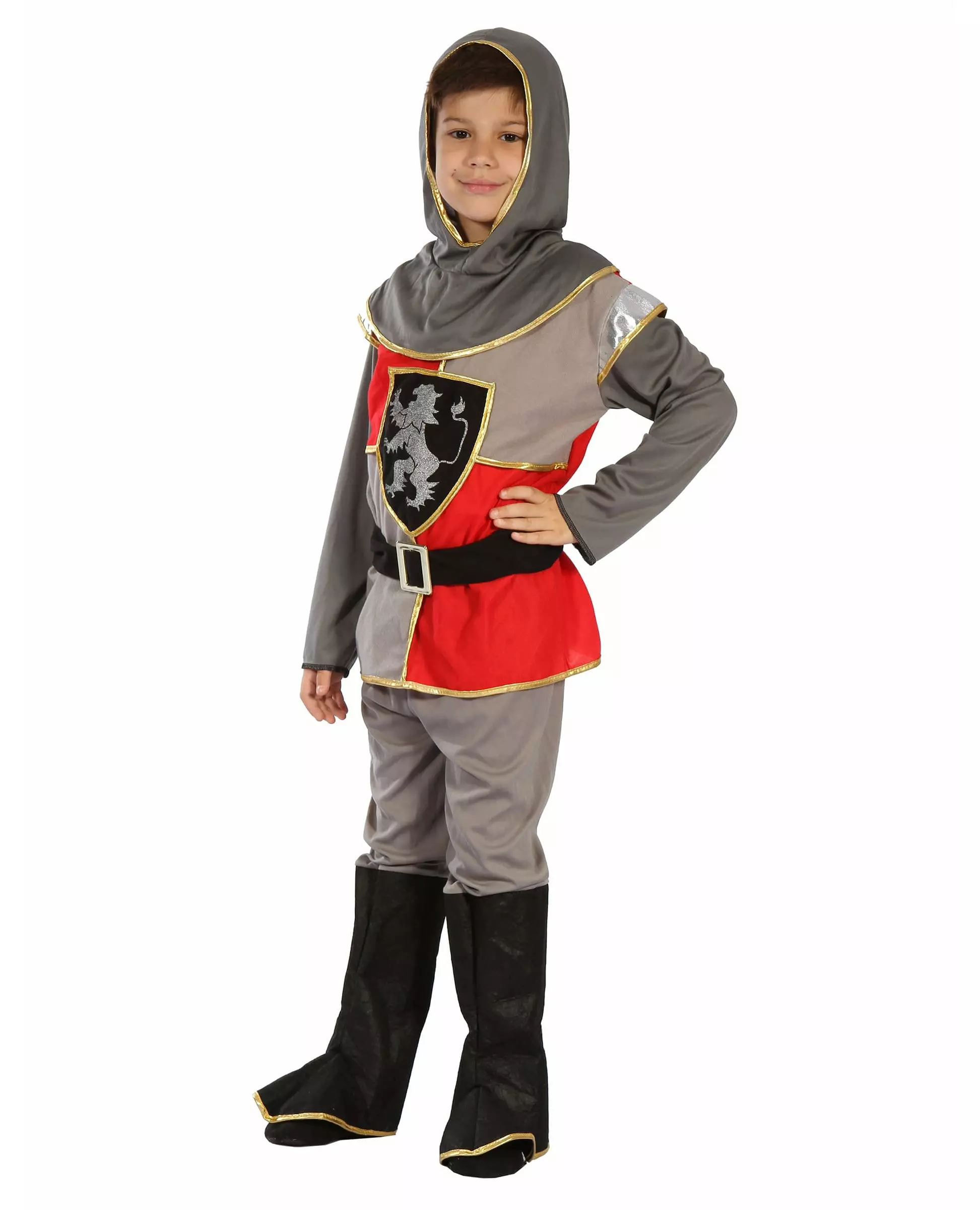 crusader warrior! This knight costume for boys consists of a tunic, a hood, a belt, pants, and a pair of overboots. The tunic is gray and red with gold trim. It also features a gray lion crest, a symbol of virility and power! Finally, this tunic features a hood and long sleeves reminiscent of chainmail. The outfit also includes a belt with a Velcro fastener and a faux buckle, as well as gray pants with elastic at the waist. Finally, to complete the whole thing, this costume includes integrated black boot covers. This costume will be ideal for transforming your son into a medieval warrior during Carnival or any other fancy dress event. Accessories included: Tunic Hood Belt Trousers with boot covers Material: 100% Polyester Care: Hand wash