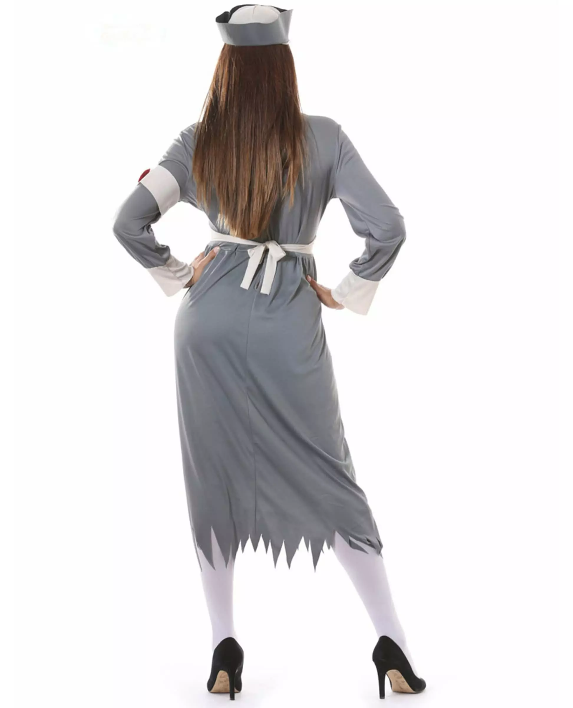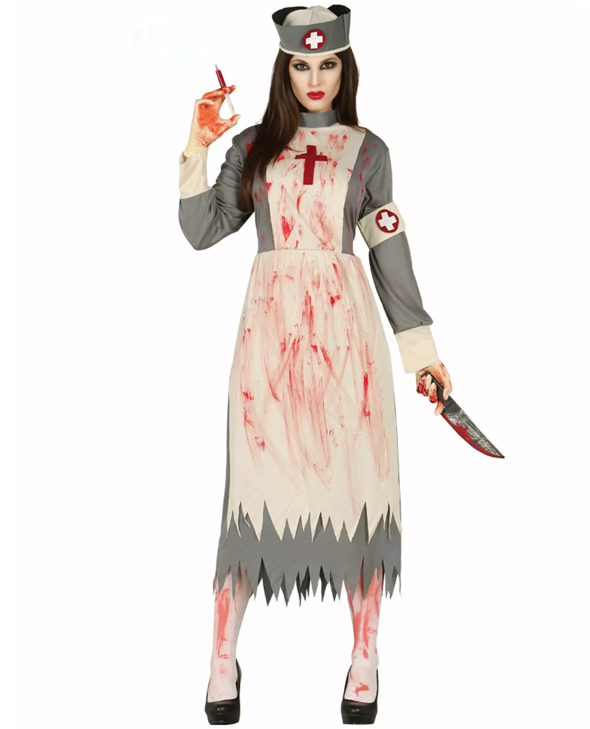 zombie nurse costume for Halloween! This retro zombie nurse costume for women consists of a long dress and a hat. The dress is gray and has long sleeves. Torn at the very bottom, it is decorated with a blood-stained apron. The hat matches the dress and features the white cross of medicine. Become a dangerous nurse for the Halloween party!. Accessories included: Dress Hat Material: 100% Polyester Care: Hand wash