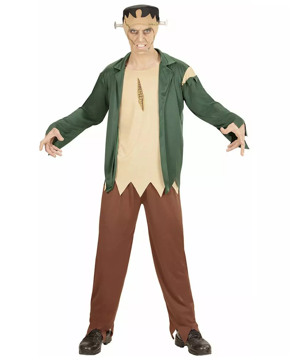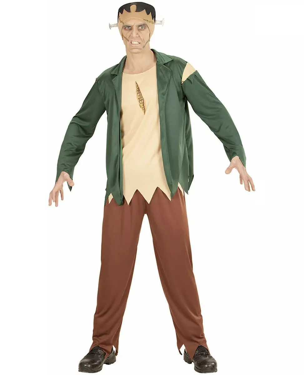 Come back as a monster! This revenant monster costume is for men, it consists of a jacket with shirt, pants and a headdress. The jacket is green with a yellow shirt. These two outfits are cut into points. A fake wound is present on the yellow shirt. The pants are dark brown and end in saw teeth. The headdress is light brown with printed fake wounds and two fake bolts on each side. This revenant monster costume will be perfect for Halloween. Accessories included: Top Pants Headdress Material: 100% polyester Care: Hand wash
