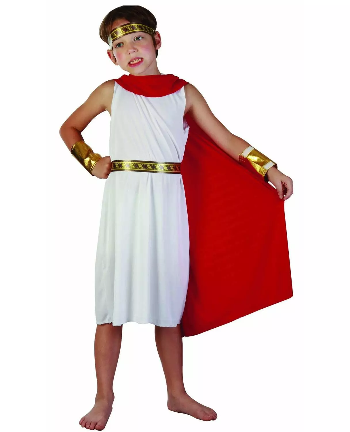 Play as a Roman and set out to conquer Gaul! This Roman costume for boys consists of a white dress, a cape, a belt, a headband, and arm guards. The mid-length white dress closes at the back with Velcro. The red fabric cape slips directly around the neck, allowing it to stay securely on the shoulders. The gold-colored arm guards with Velcro add a more realistic touch to this costume. The headband has an elastic band for added comfort. (Glaive not icnlsu) This costume is perfect for playing a real Roman during your fancy dress parties, for a show or even the carnival. Accessories included: Dress Cape Headband - Belt - Arm guards Material: 100% polyester Care: Hand wash