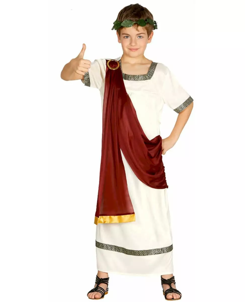 Like Caesar, rule Rome for a fancy dress party This Roman Emperor costume for children consists of a draped dress (shoes and crown not included). The long dress has short sleeves. It is decorated with a long dark red and gold drape. This costume will be perfect for pretending to be Julius Caesar at Carnival. Accessories included: Dress Material: 100% polyester Care: Hand wash