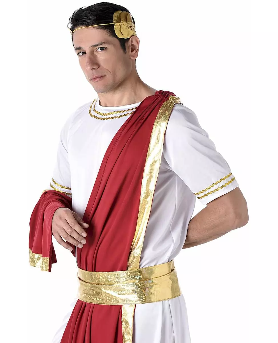 Veni, Vidi, Vici! This men's costume consists of a tunic, a belt, and a headdress. Inspired by traditional ancient togas, the short-sleeved white robe is adorned with gold embroidery on the collar, arms, and hem. Reaching the calves, it pairs with the burgundy red panel, which is identical to the Roman himation, and is worn across the shoulder for a very realistic look! Add the gold metal headdress decorated with gold leaves to your head, tie the gold belt around your waist, and head to the forum to meet your subjects! Be strategic, eloquent and brilliant at your Peplum themed fancy dress parties and impress your friends with this Emperor costume!. Accessories included: Tunic Belt Headband Material: 100% polyester Care: Hand wash Measurement information: For a size M, the dress measures approximately 120 cm.